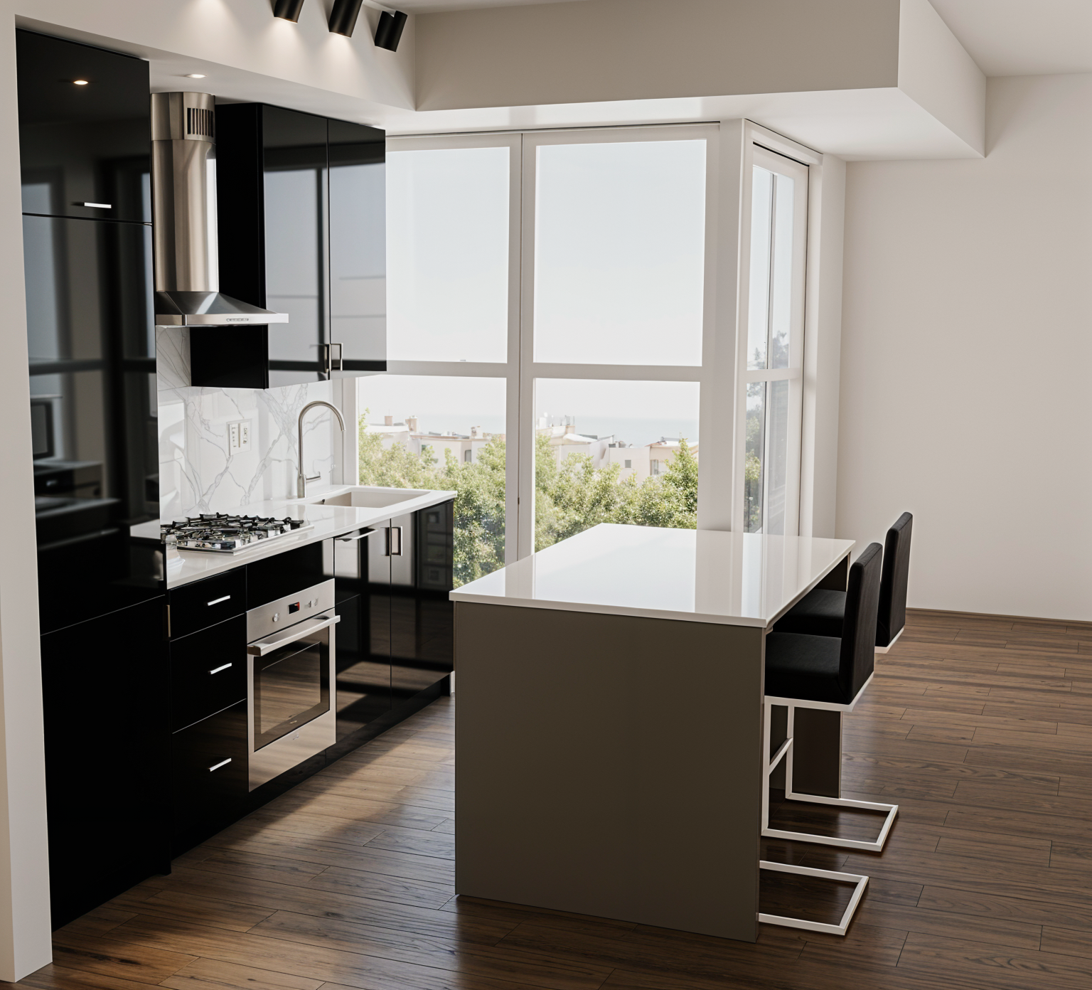 create architectural sketch with realistic finishes neutral render with random neutral beige stone pillars to outdoor kitchen show pale blue with clouds in sky only render finish to outdoor kitchen splashback maintain native landscape as shown create shadow and definition between material changes