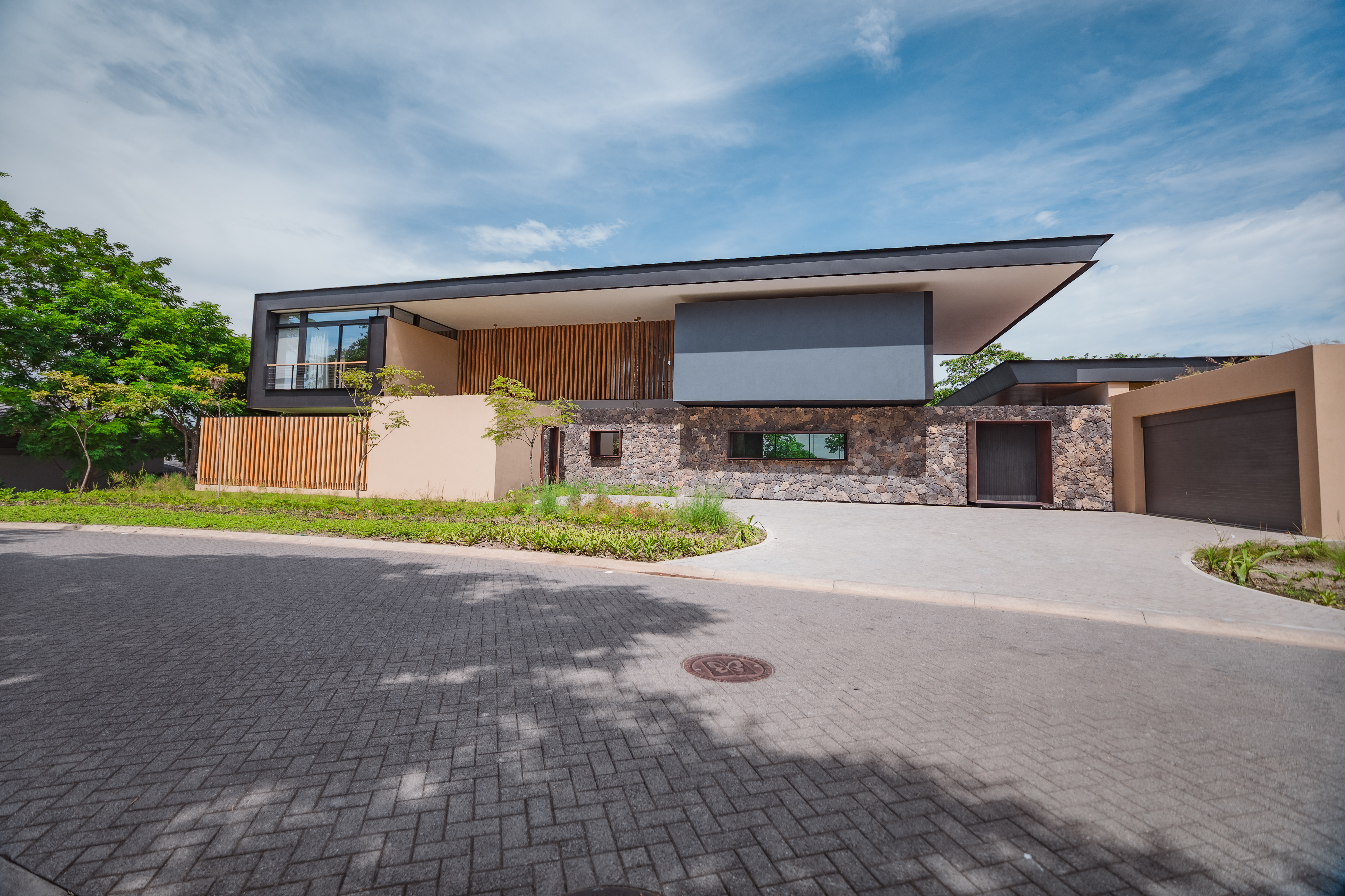 add hyperrealistic tropical vegetation to this photograph include small and medium sized trees but do not block view of house add afternoon ambient lighting and show low level interior illumination maintain shadows as is in photograph