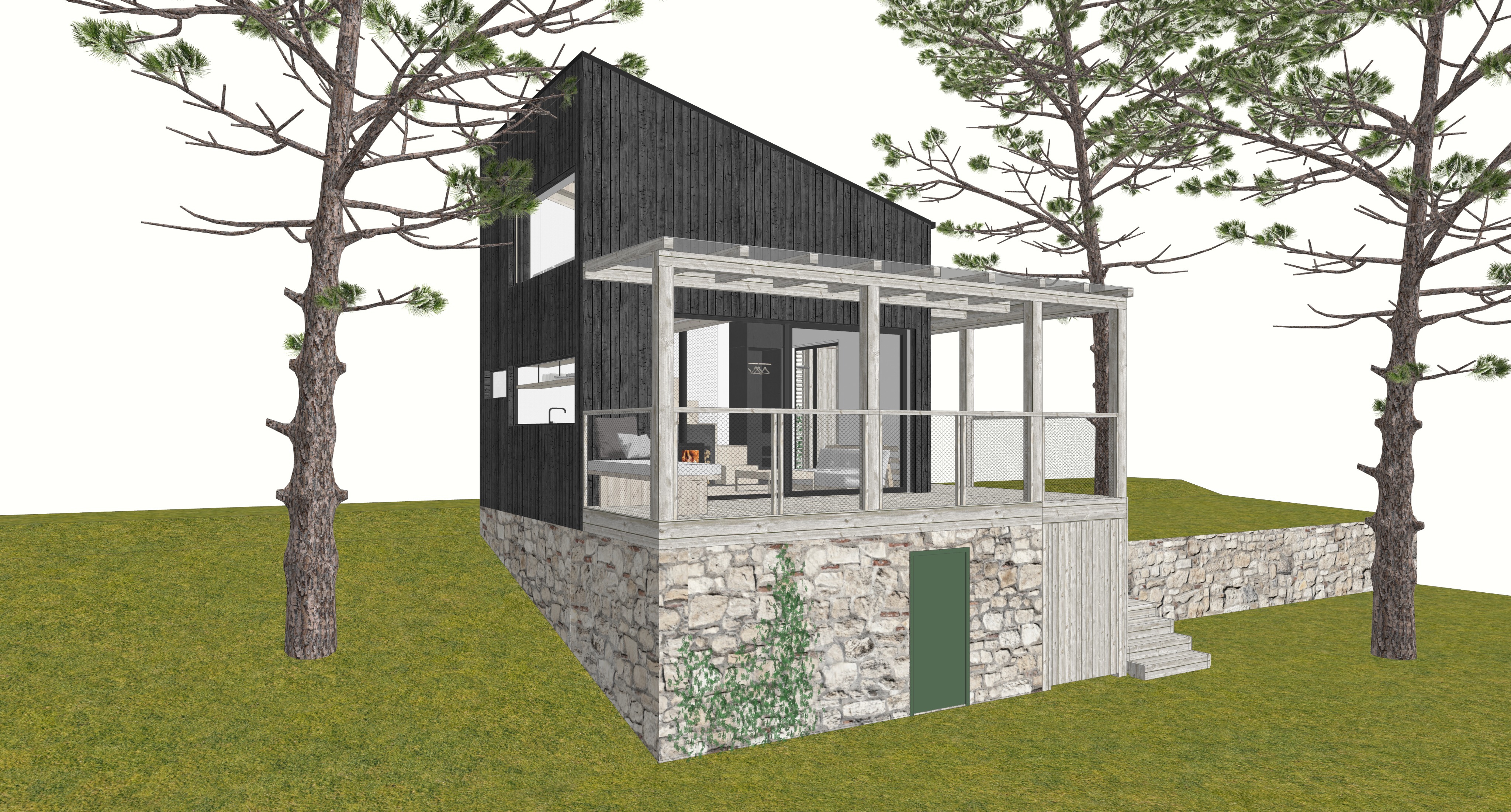 cottage in the woods surrounded by trees smoke from the chimney shrub and ferns on the left side