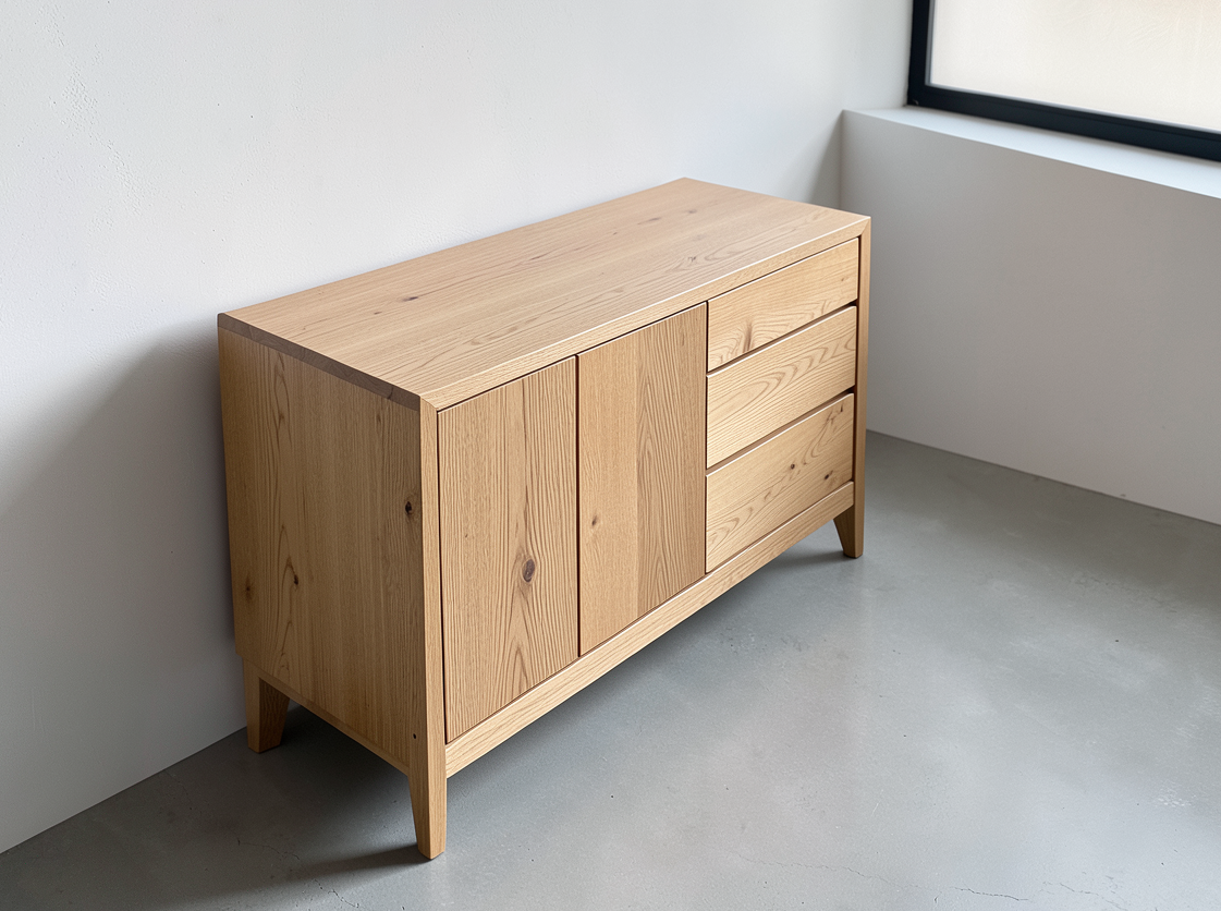 nordic minimalist wooden dresser in light oak positioned against a smooth white wall and resting on a polished concrete floor the atmosphere is serene and modern with soft natural light coming through a large nearby window casting gentle shadows the room is accented by a calm and airy vibe highlighting the natural grain of the wood and the simplicity of the design colors light oak wood soft white wall cool gray concrete