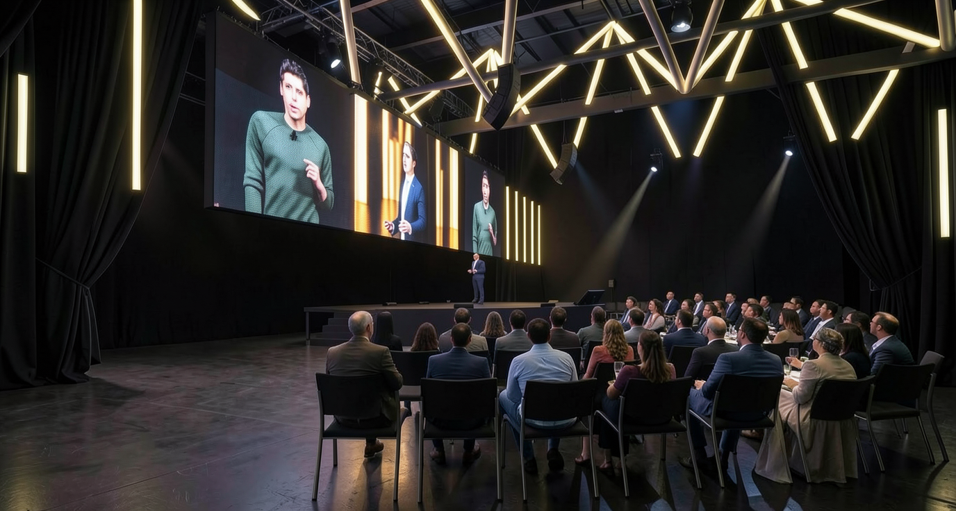 a dark immersive stage environment with an oversized suspended led screens black drapes to perimeter