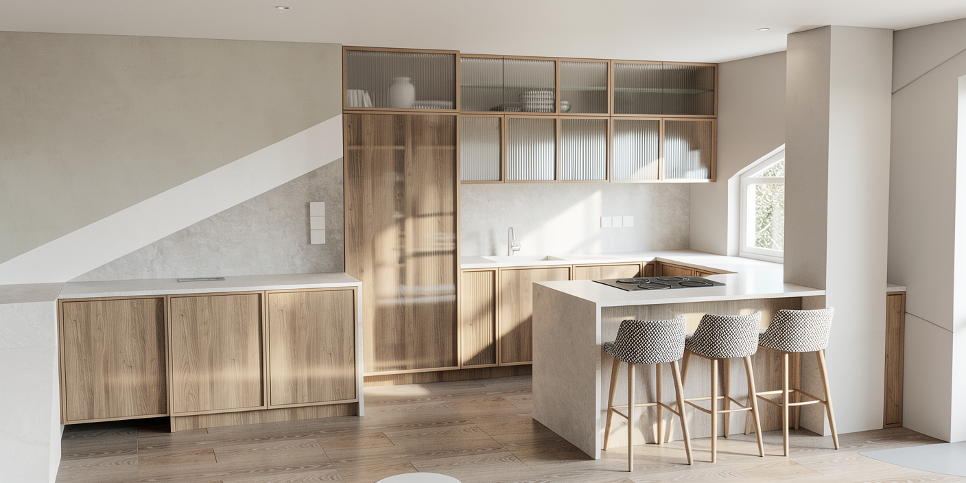 the upper see through cabinets should have a fluted glass effect on top of the fridge there is no fluted glass closed cabinet with wood finish keep original barstools make sure that on the left side of the render there is a corner staircase on the right side of the render there is a window