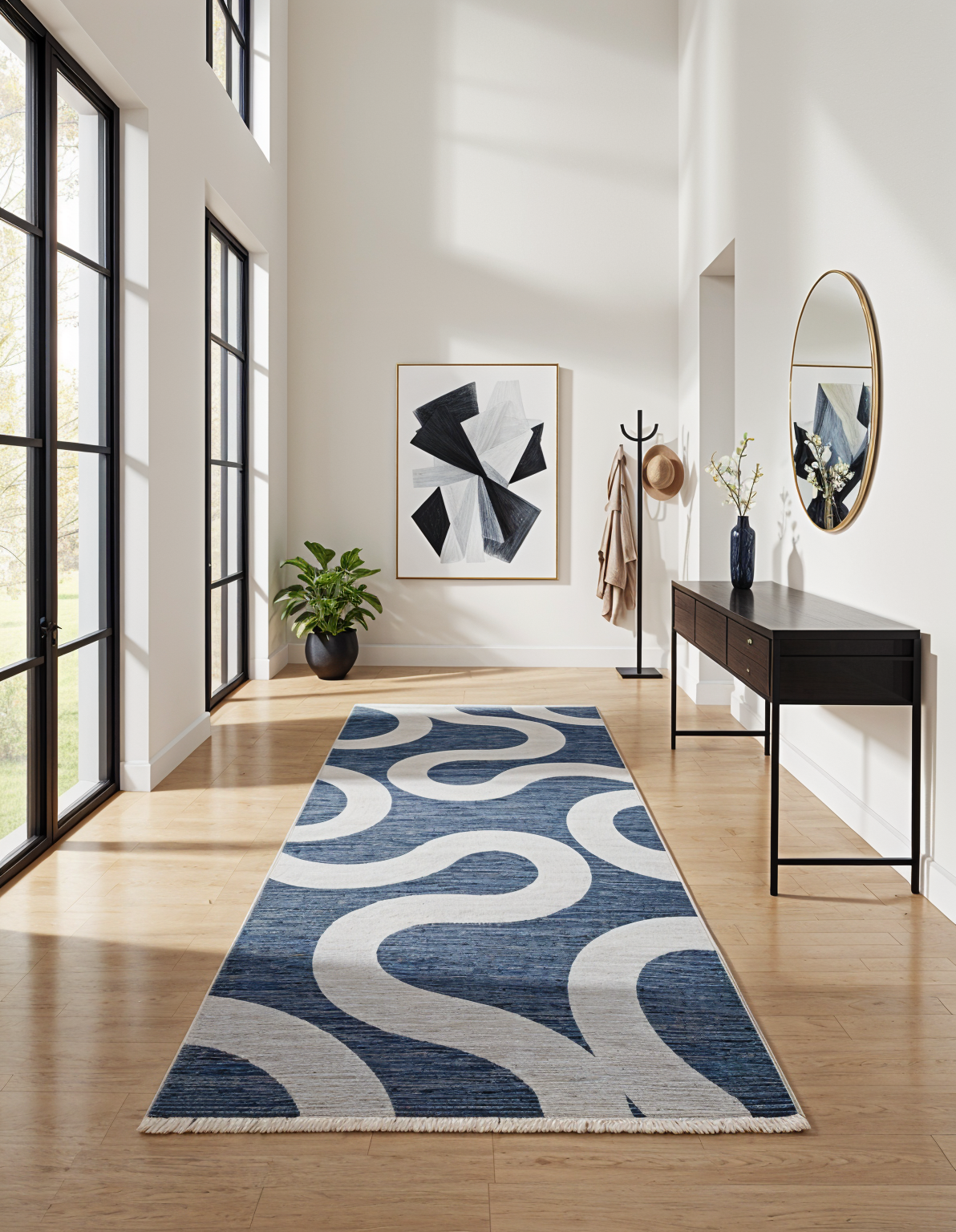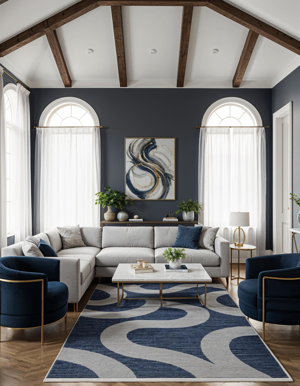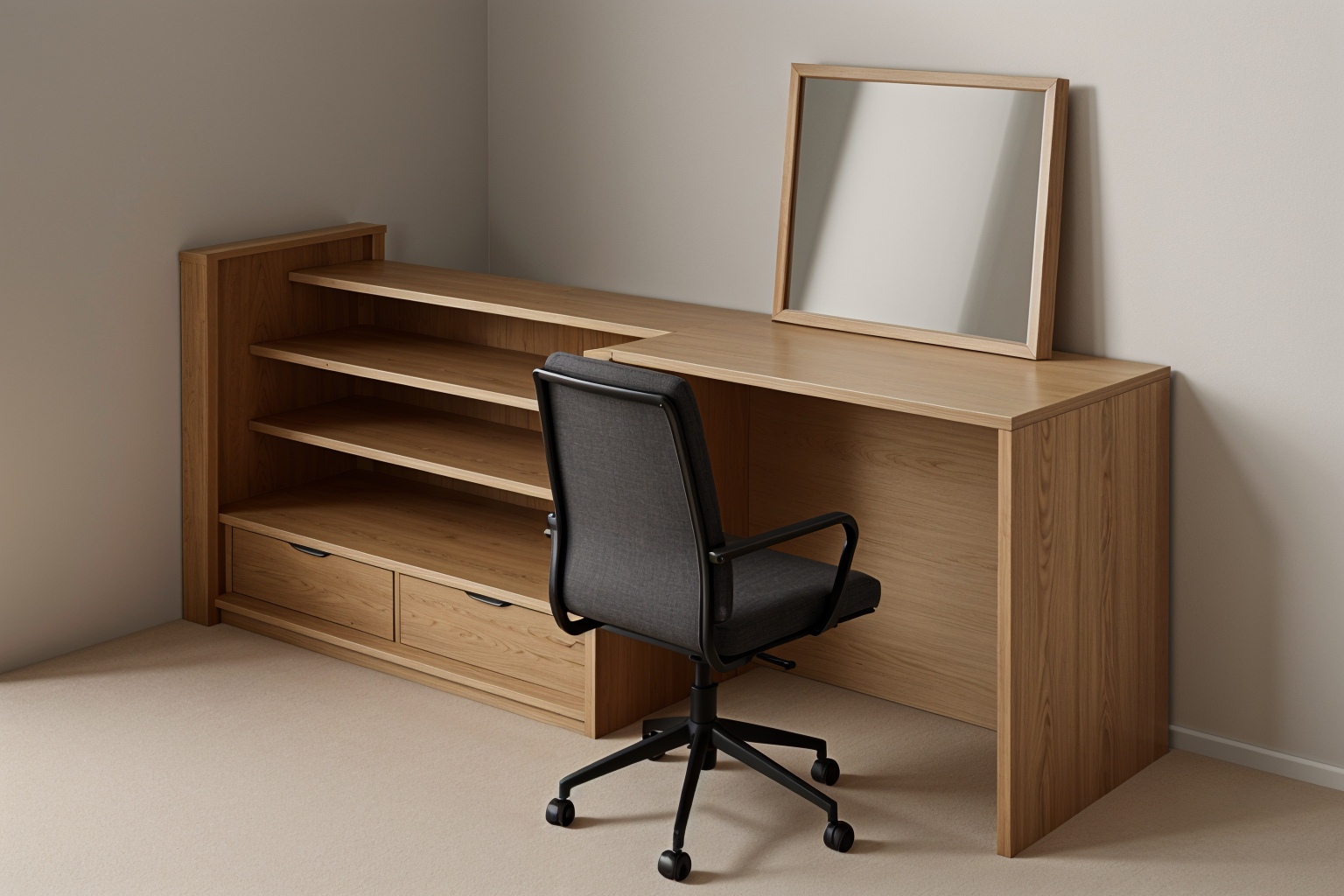 modern kitchen design featuring a sleek island with light oak wood base matte black countertops and matching matte black hanging lights the bar stools have light oak frames with dark grey cushions the cabinetry combines light oak with graphite grey for a sophisticated look a stainless steel refrigerator and microwave are integrated into the layout the backsplash is a subtle textured light grey concrete finish large windows bring in natural light casting soft shadows and the atmosphere is warm and inviting the overall ambiance is minimalist and elegant with a harmonious blend of neutral tones