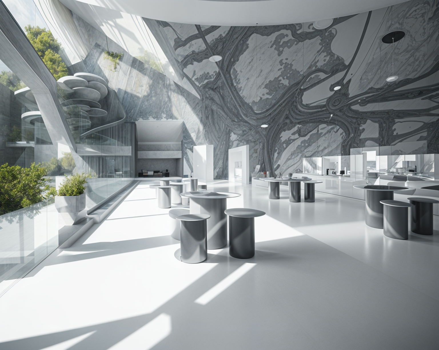 sustainable design interior shot industrial accessible lobby area with cafe area and stair feature architecture