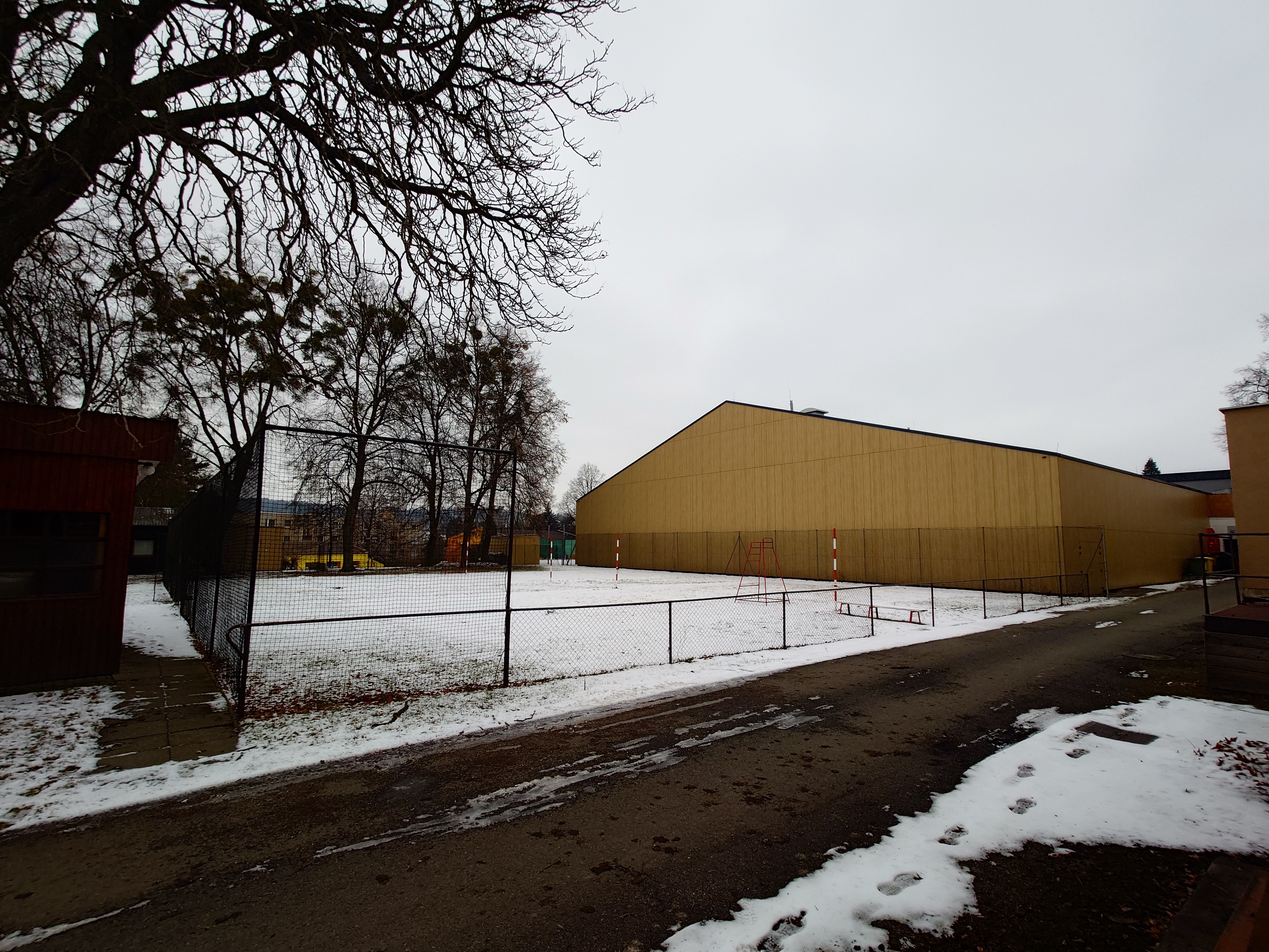 put in two padel courts by hall facade put two volleyball courts one behind the other with the shorter sidel to front part of playground summer erase three trees by the back of hall