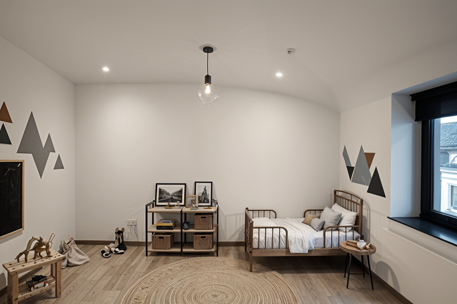 create a garden design with neighbors in the background mood at dusk with partial interior lighting supplement outdoor lamps exterior walls plastered white white window frames dark gray roof tiles stlye new building in germany architecture
