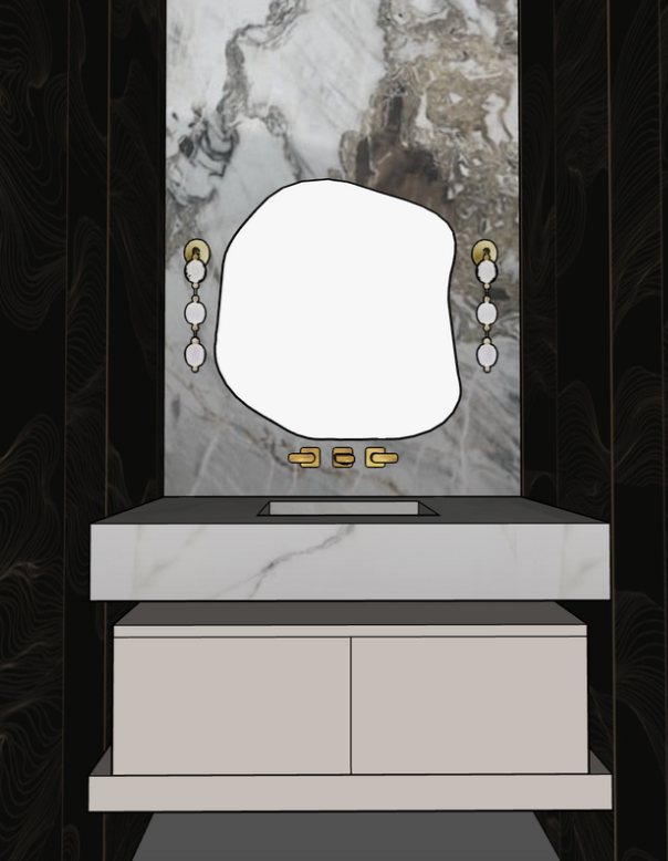 make the side wall a black wallpaper with gold abstract lines and make the back wall marble