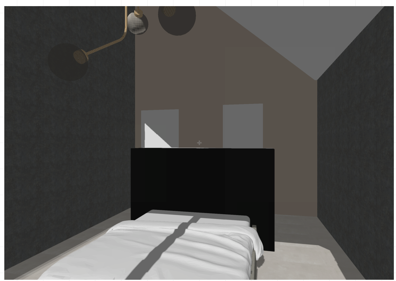 make the lamp lightning add natural light as well make the back wall a darker color as well keep the wall papers on the left and right side make the bed wider the furniture behind the bed is bed board made of matte black smooth furniture panels with a bookcase