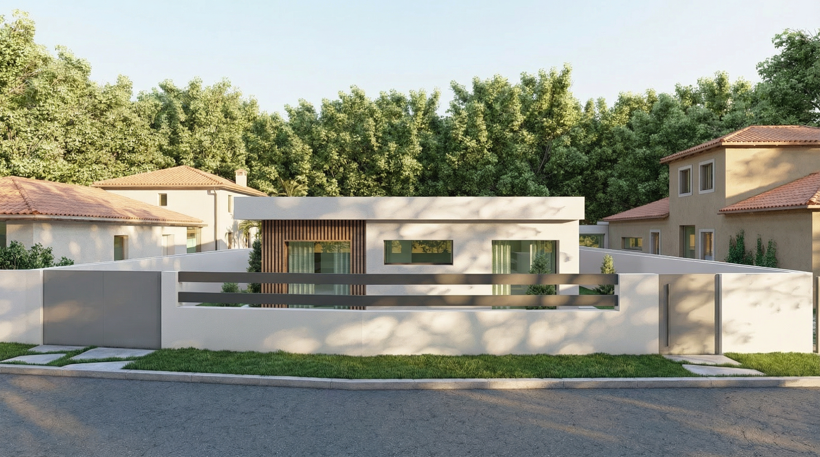 render a photorealistic 3d keep the same materials same walls same roofs dark brown window frames and metal brown fences native plants do not change the geometries and shapes keep this camera view of the model use warm mediterranean summer light late afternoon feeling put curtains behind closed windows do not change the geometries and shapes