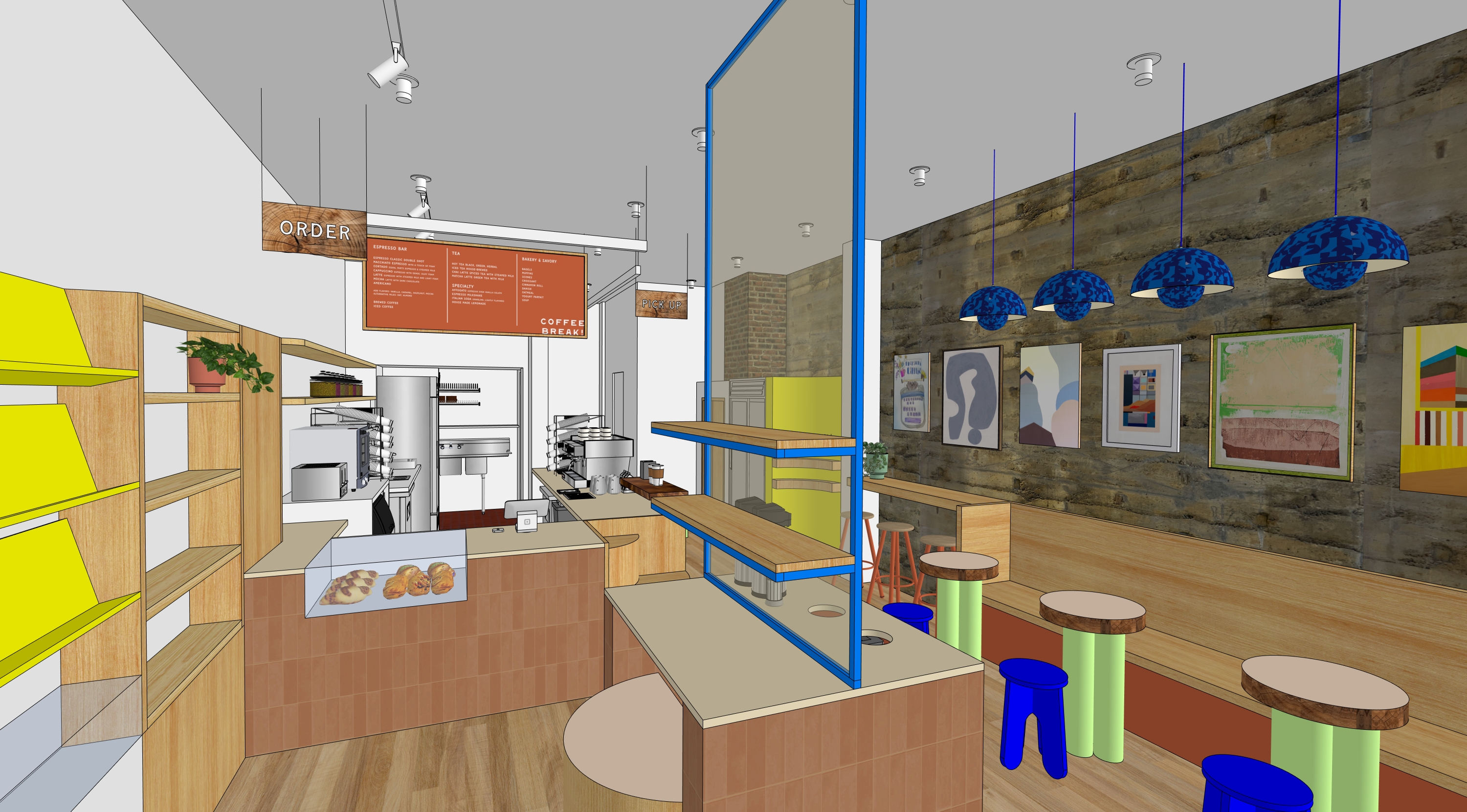 this is an interior view of a coffee shop the ordering counter has tile on its facade and the furniture is oak and jade green powder coated metal the left of the room has a small area of yellow shelving the space has soft natural light in it but do not render any surfaces as windows there are no windows in this image the tabletops are thin laminate in a deep coral color make the short stools cobalt blue do not change anything or add anything to the structure of this image