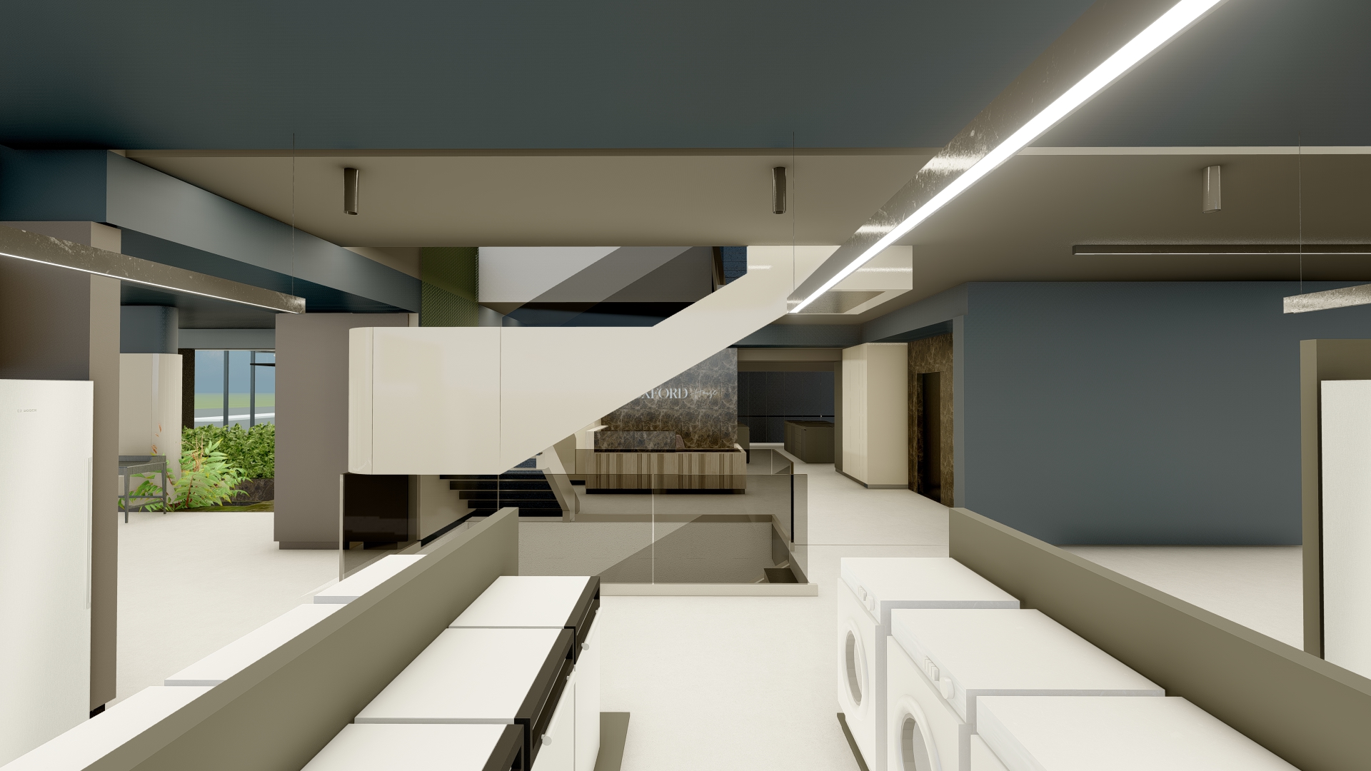 this is an appliance showroom keep the picture as it is add only people viewing the products on display and some in the background dress should be casual
