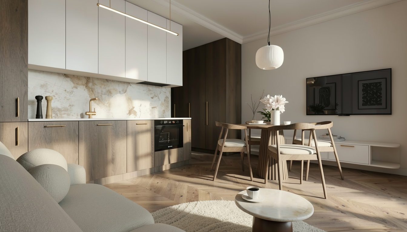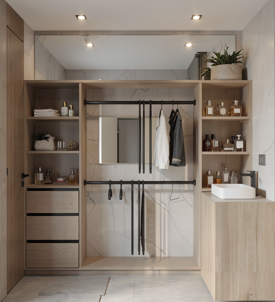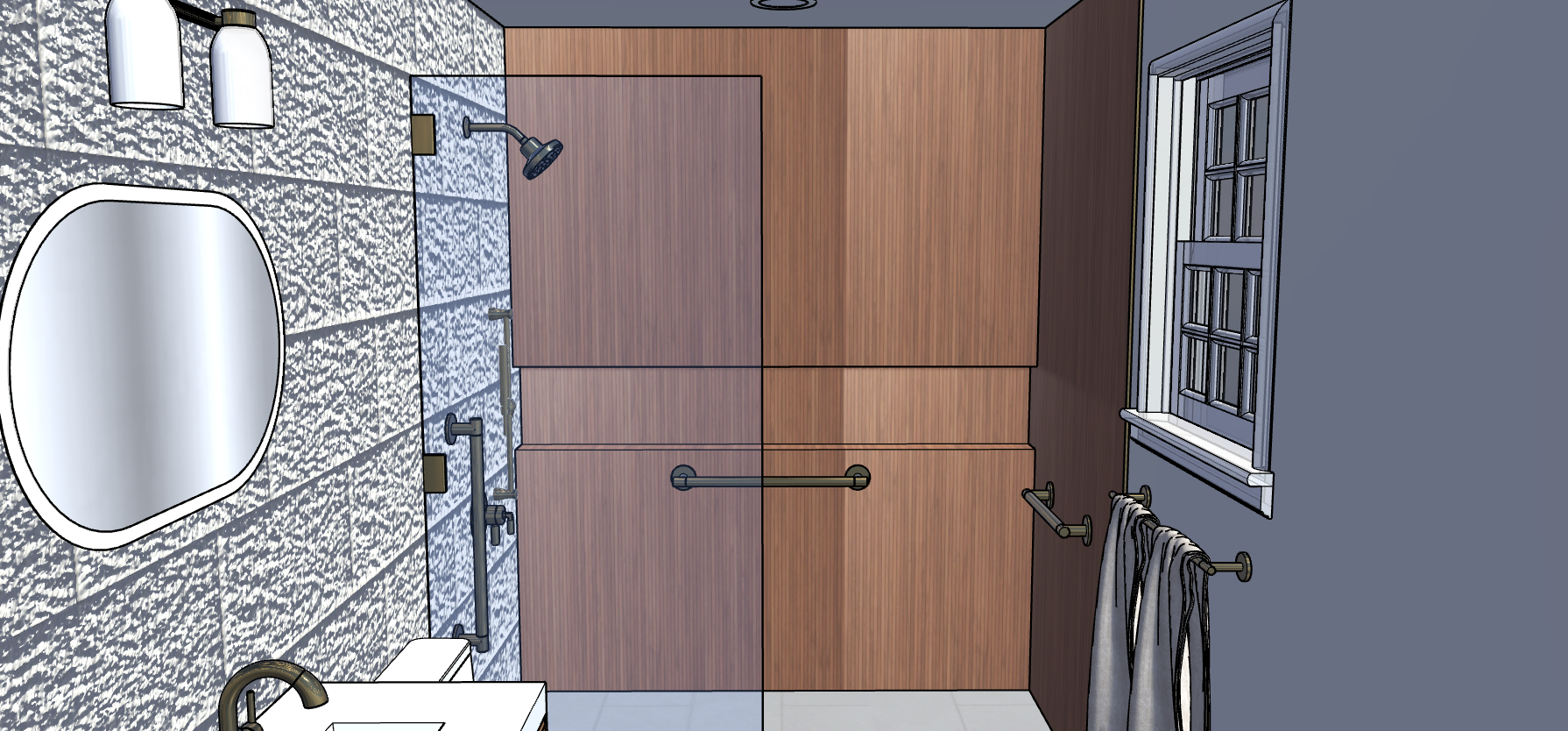 preserve all existing textures geometry materials colors and proportions overall scene is evenly brightened using neutral warm lighting only do not add highlights glow reflections or new light sources lighting comes only from mirror with soft white semi transparent backlit halo warm evenly diffused there is no sunlight nor any light source other than the vanity light and backlit mirror the shower head and all shower fixtures are not light sources and emit no light all metal hardware and accessories are brushed brass the wood tiles are uniform in color with different shades and grains the other tiles are unicolor with 3d horizontal chiseled texture with a color code rgb 234 228 218 walls with no tile on them are painted in a rgb 234 228 218 color the light switches are white