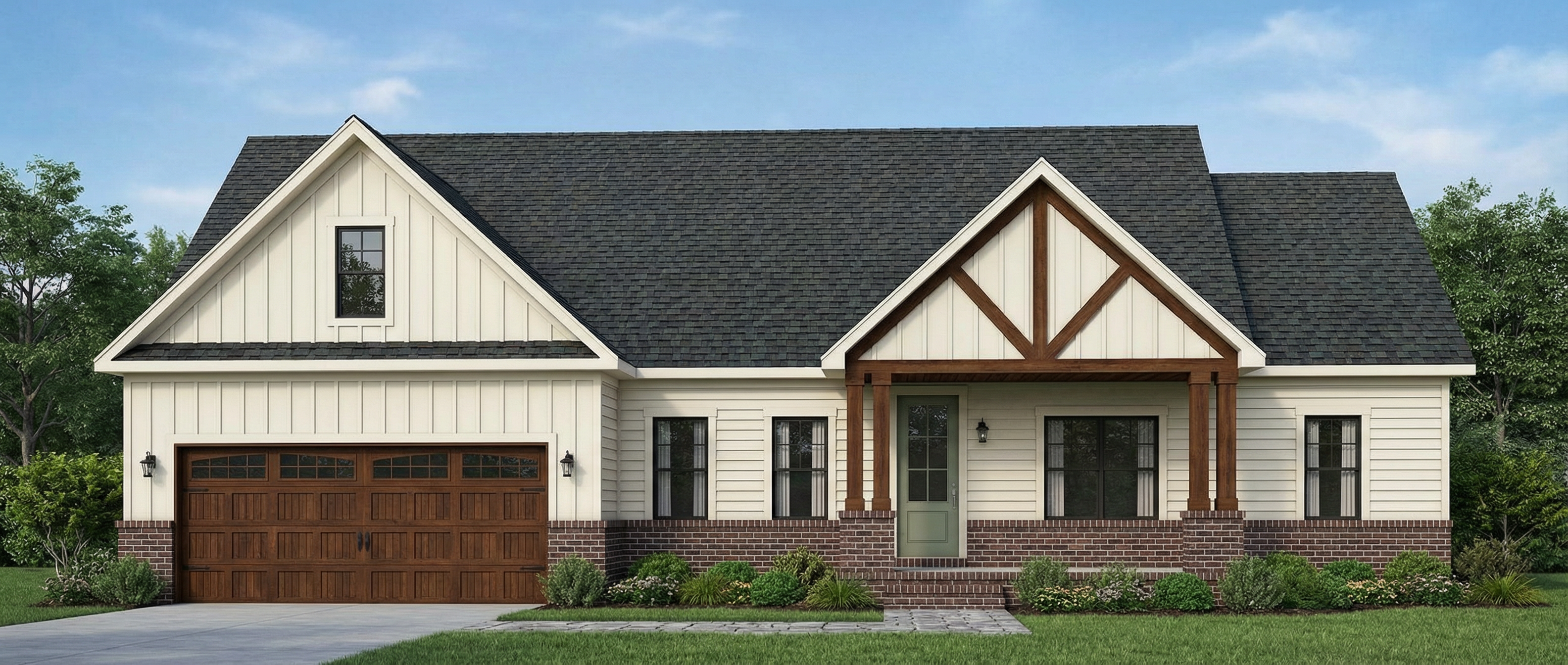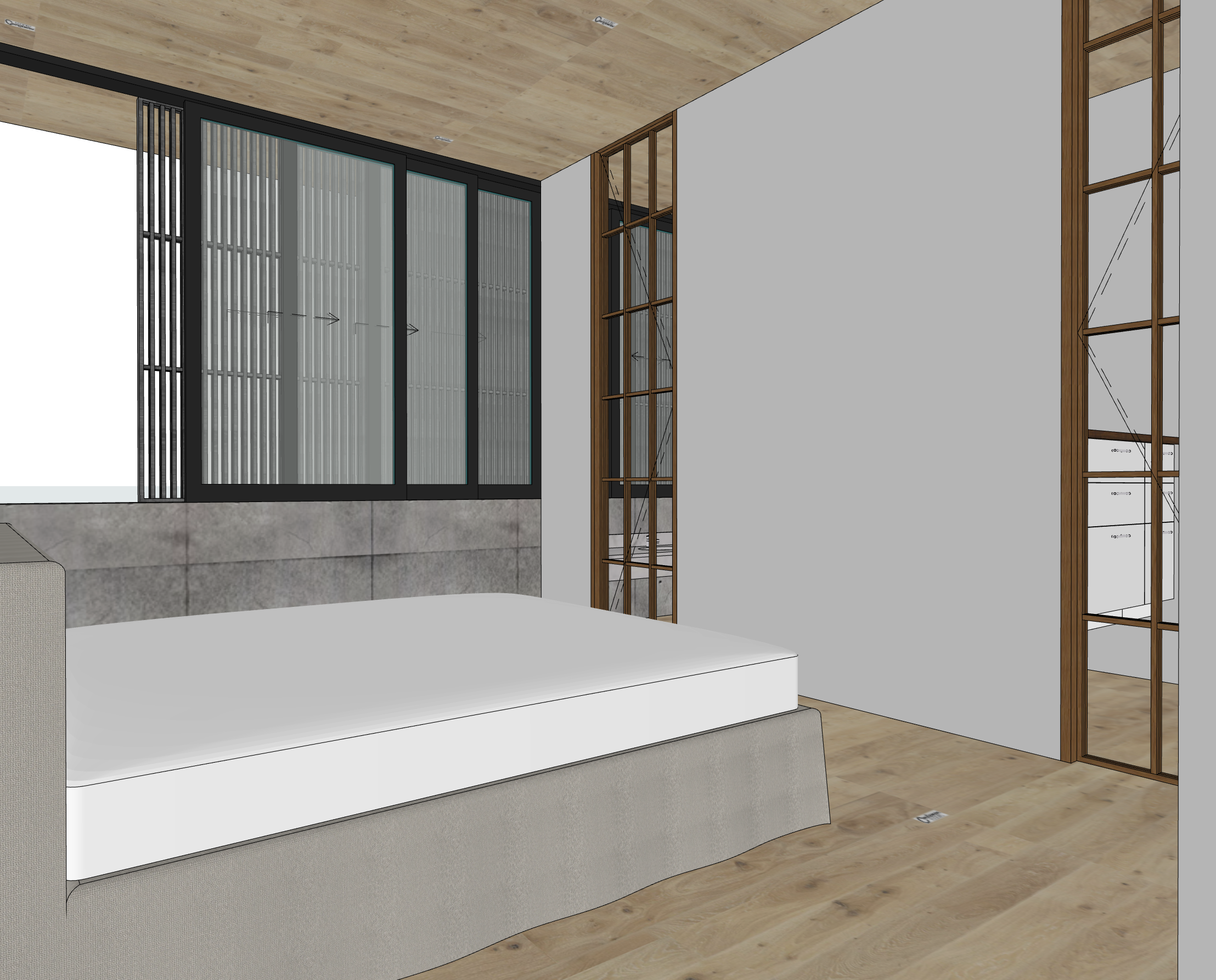 this is a kids bedroom a modern interior room with a cozy and warm atmosphere the walls are painted in a soft neutral gray the wooden floor ceiling desk and cabinetry are made of light oak wood giving a natural and inviting feeling the large window features dark framing offering a glimpse of soft diffused natural light this is a kids room suite bedroom add in soft led lighting and artwork onto the walls the headboard runs the full width of the wall the wood tones are light oaks add pillows and soft finishings to the bed and surrounds the view through the window is of beautiful mature african trees