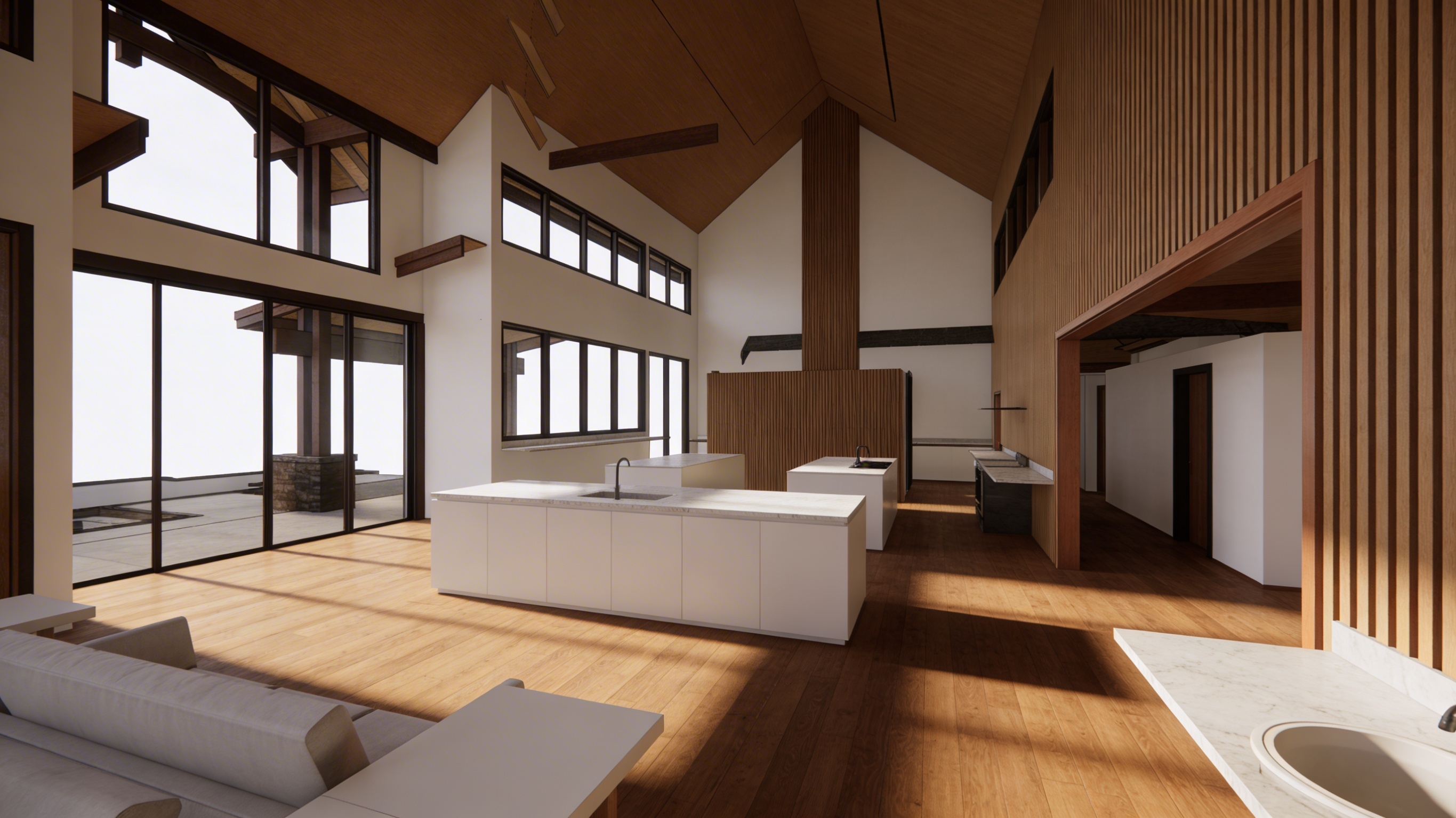 a bright and warm modern interior architectural visualization wide angle living space vertical timber wall panels oak flooring soft daylight filtering through large windows calm and serene atmosphere cinematic interior render soft shadows editorial architectural composition calm spatial depth conceptual yet realistic presentation white walls warm modern wood floors white ceiling with exposed wood beams white cabinets with marble countertops in the kitchen beautiful backyard outside the windows modern chandelier hanging from the ceiling providing soft light