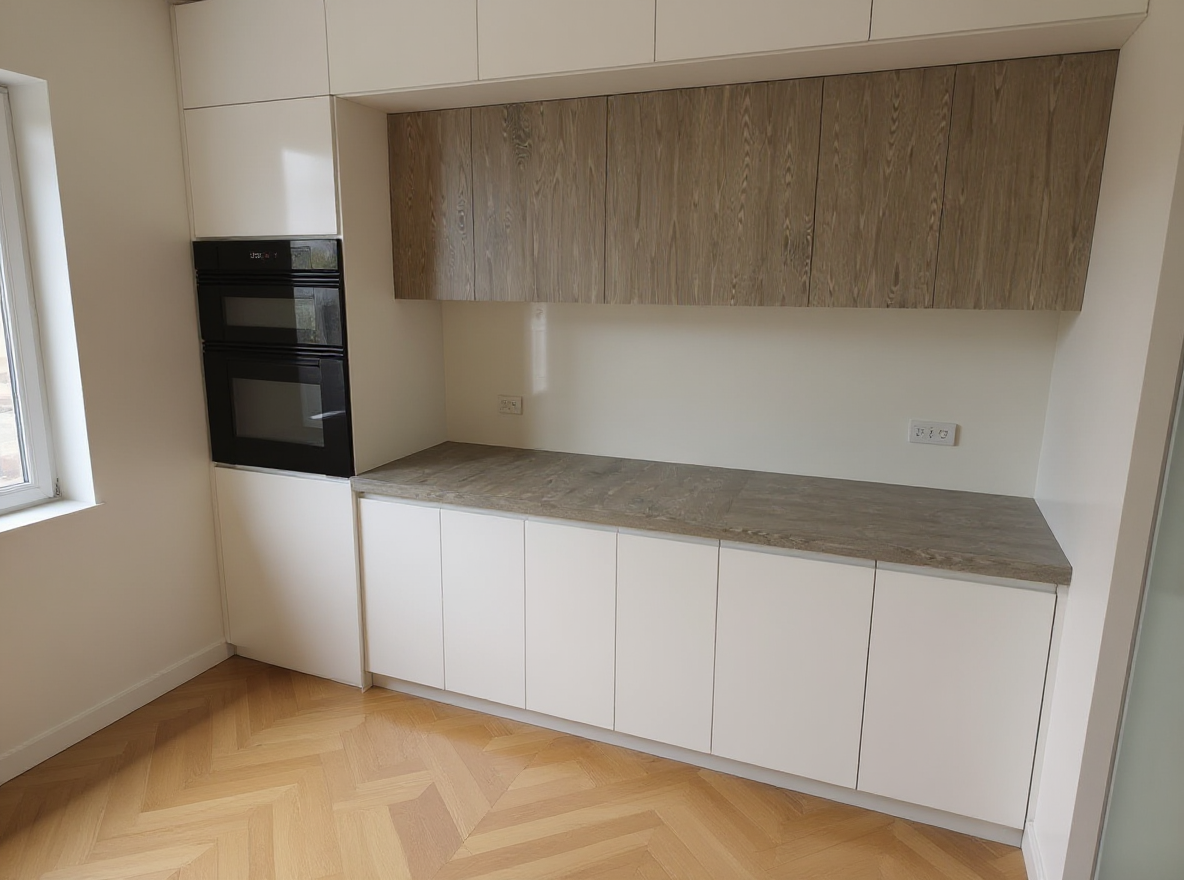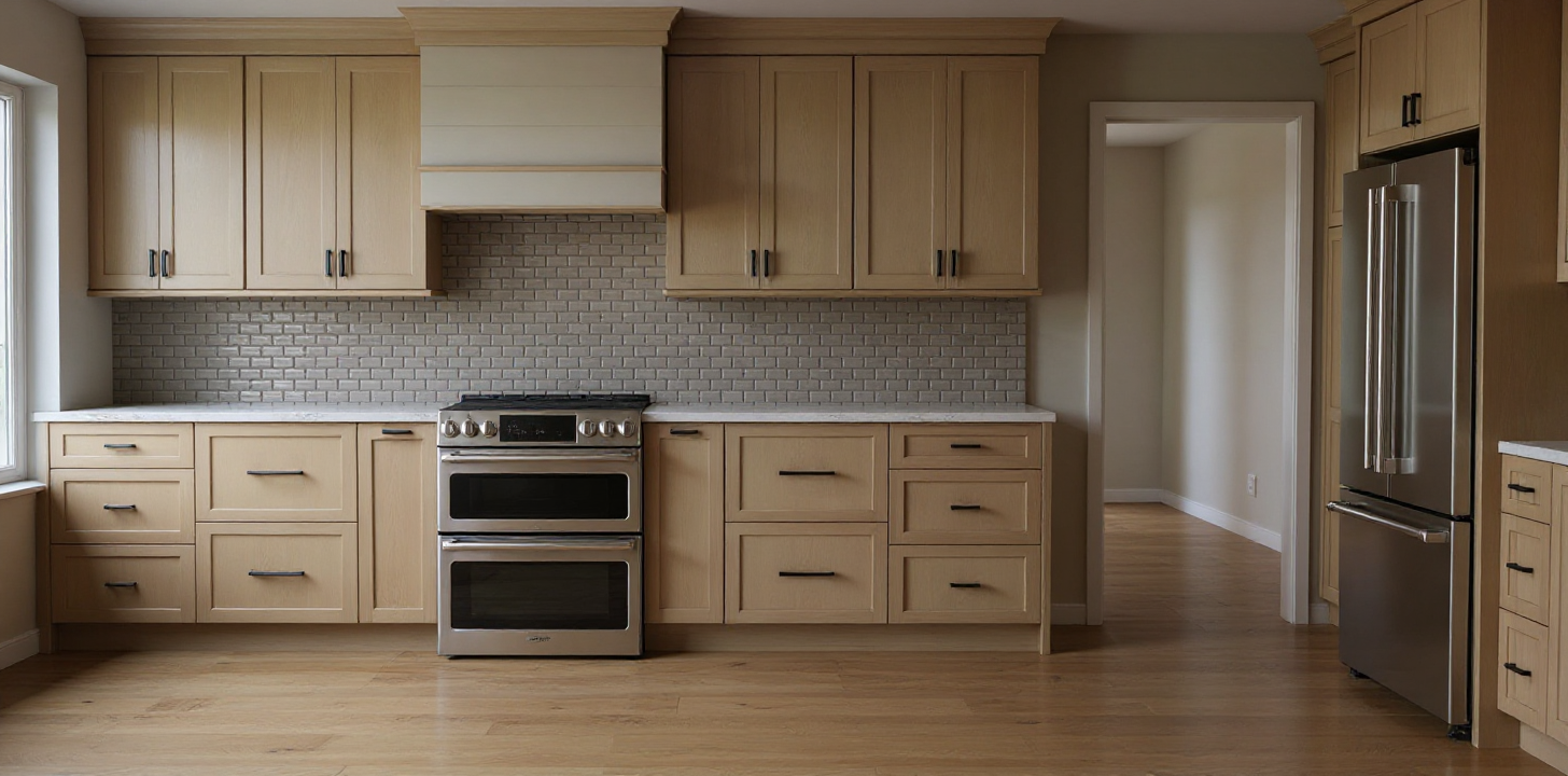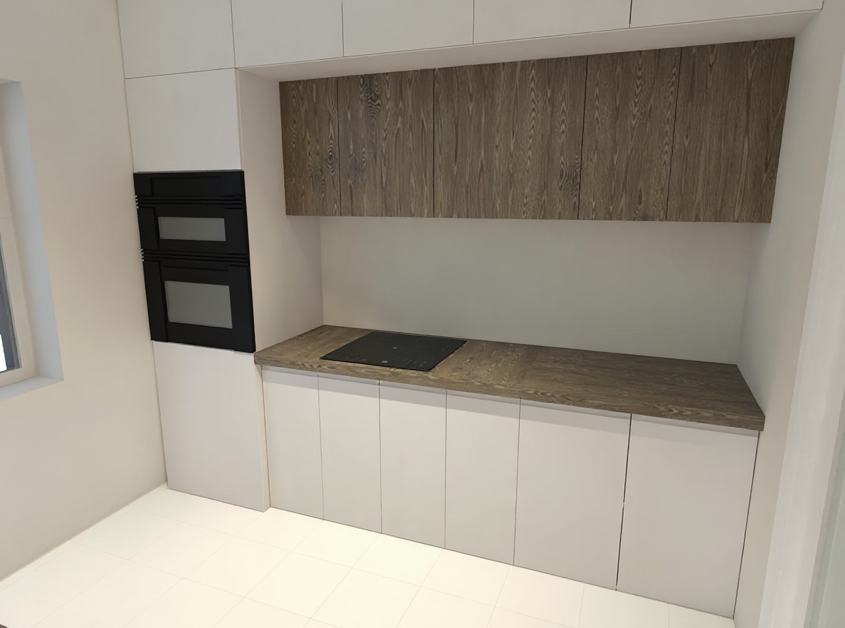 so the wall color stays as it is we re not changing that only the beige part of the kitchen cabinetry should be two or three shades darker the tiles should be white with white grout and place an induction cooktop on the kitchen counter
