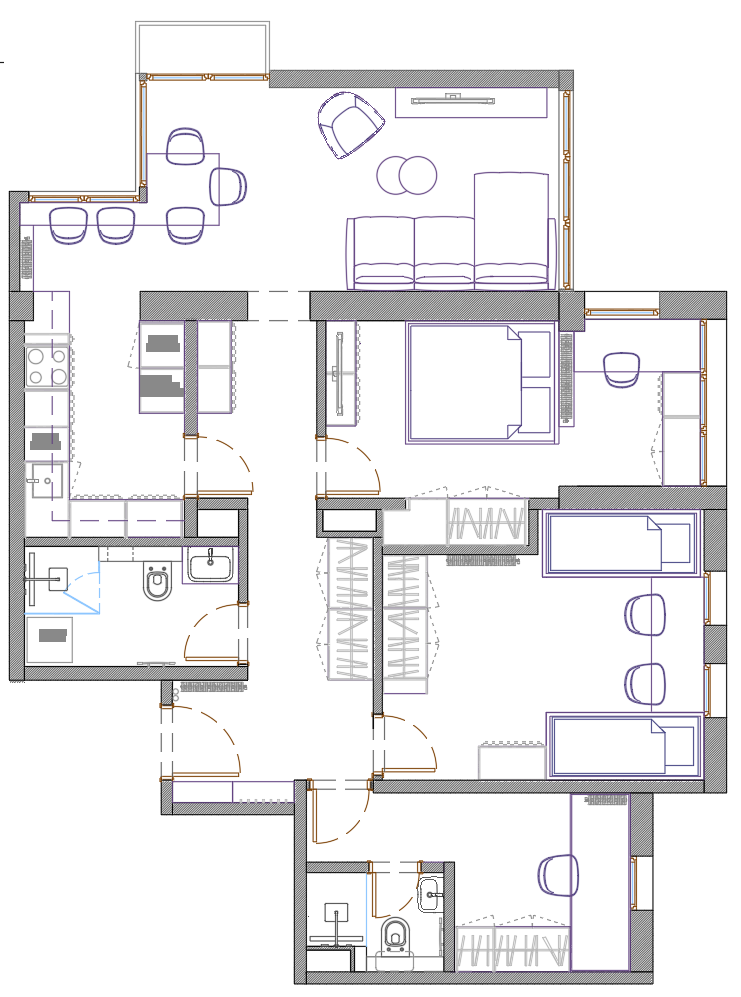 convert this floor plan into a realistic isometric 3d view of a full house show the space from an elevated angle with furniture walls and details visible respect furniture size and orientation respect wall and furniture layout furniture should be modern cozy homie style colors light beige white light oak wood light pastel green details kitchen floor is light beige stone style bathrooms floors are light grey stone tiles in the kitchen white terazzo style square tiles in the kitchen worktop is light oak upper cabinets are white down cabinets and high cabinets with built in fridge oven and microwave are pastel green in the rest of the appartement floor is parquet light oak all the closets are white all room doors are white natural light coming from the windows space in the down right corner of the plan with a small private bathroom is home office use the same furniture as shows on the plan do not change the orientation of the floorplan