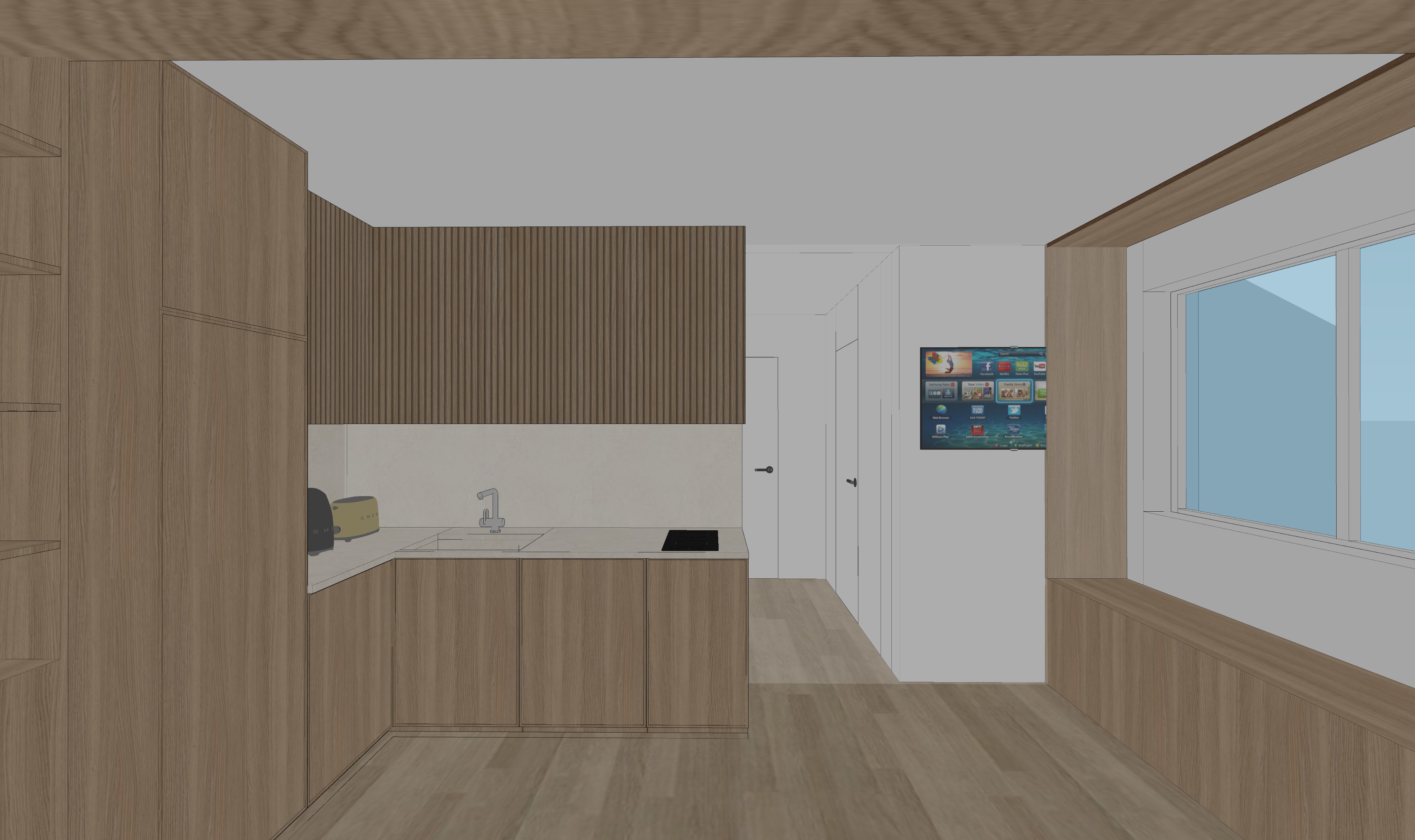 a modern living room with a cozy and inviting atmosphere the sofa is plush with a dark grey color creating a contrast against the soft beige walls the wooden shelves and paneling are made of rich mahogany giving a warm and natural feel a large window allows natural light to flood the room highlighting the subtle texture of the cream colored carpet the ceiling and floor have a matching light oak wood finish adding to the spaciousness the overall ambiance is calm and elegant perfect for relaxation and comfort light wood color in the kitchen cabinets white ceiling exact view without the sofa