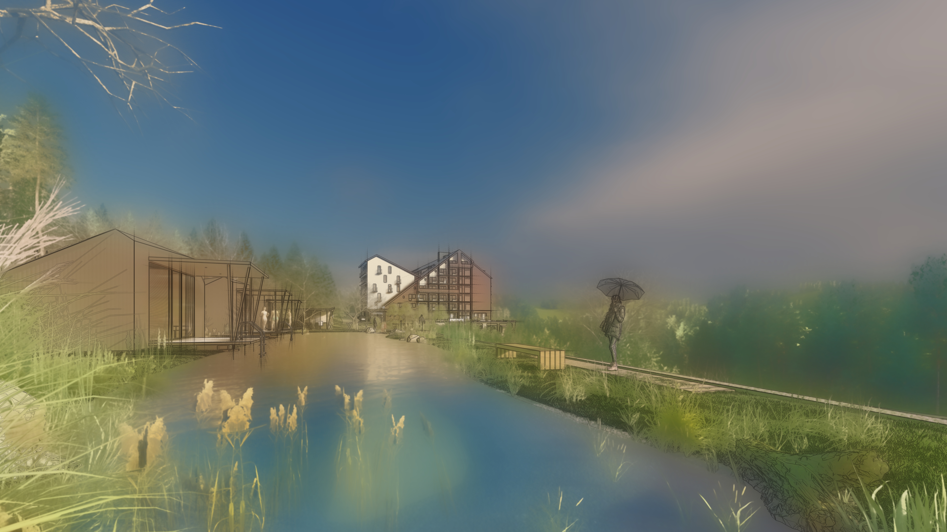 ultraphotorealistic architectural landscape photography of the orea horizont resort in umava elezn ruda the foreground features a crystal clear natural biotope swimming pond with realistic water ripples and high detail aquatic reeds and sedges on the left a row of modern minimalist cabins clad in charred vertical timber and large glass walls reflects in the water a wooden boardwalk path with a wet realistic texture leads towards the distant main hotel complex which retains its iconic white plaster and dark gabled wood silhouette the atmosphere is a moody misty morning at dawn soft volumetric fog clings to the water s surface and drifts between the dense pine forest in the background a lone realistically rendered figure with an umbrella walks along the path adding a sense of scale and quiet luxury soft cool morning light with a hint of golden sun breaking through the mist physically accurate reflections 8k resolution cinematic wide angle lens premium editorial travel magazine quality sharp focus on the foreground textures with a natural transition to the misty background