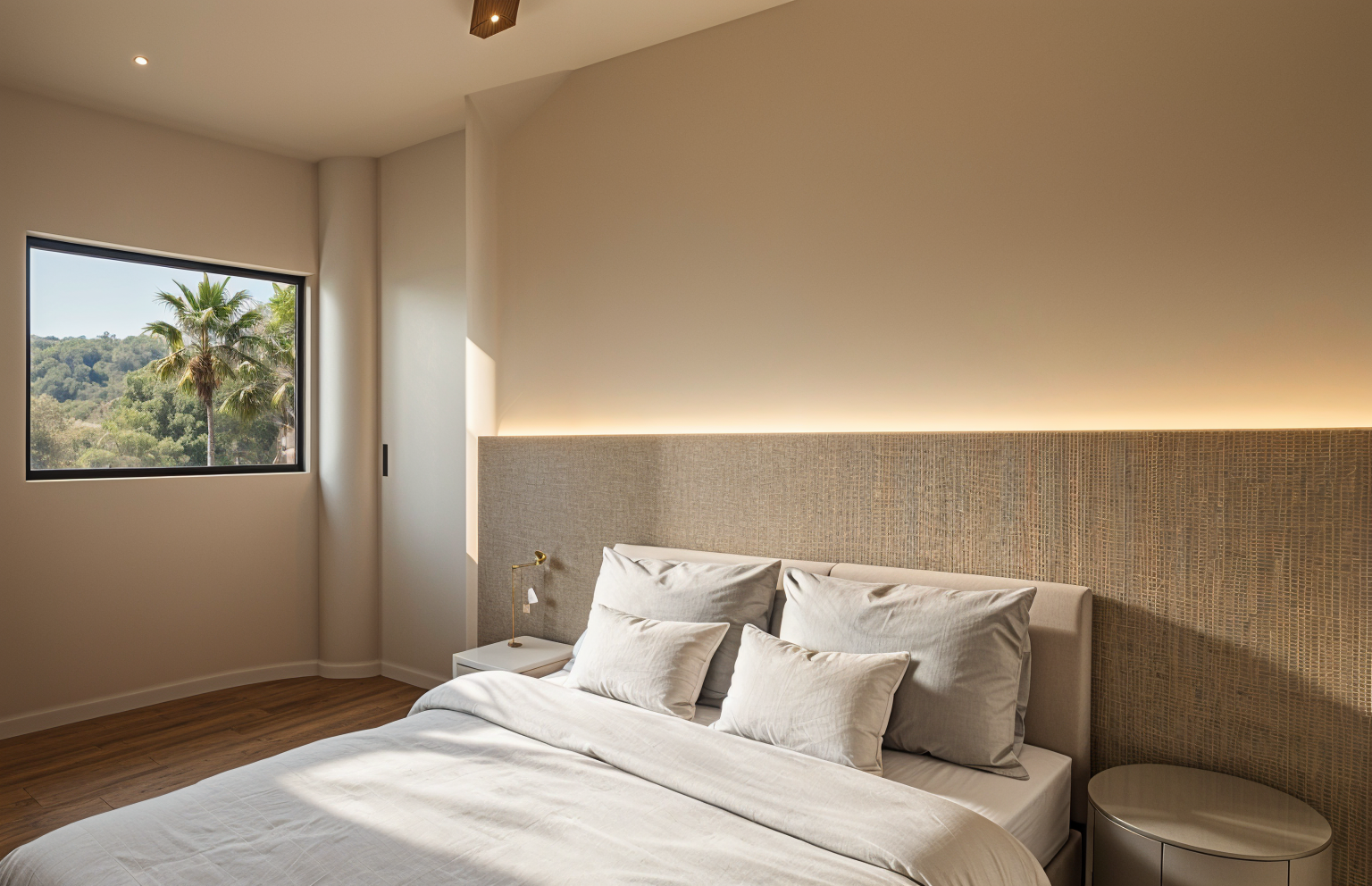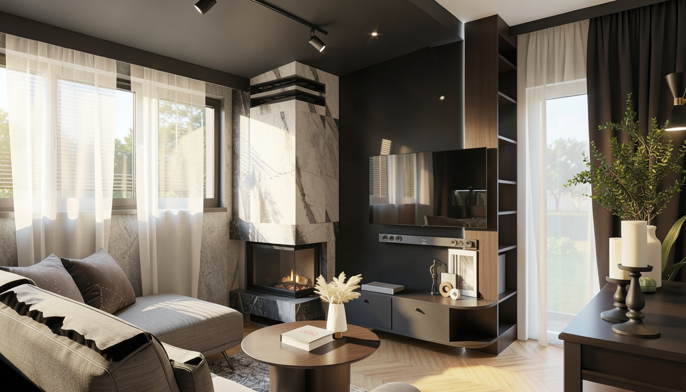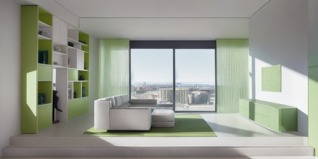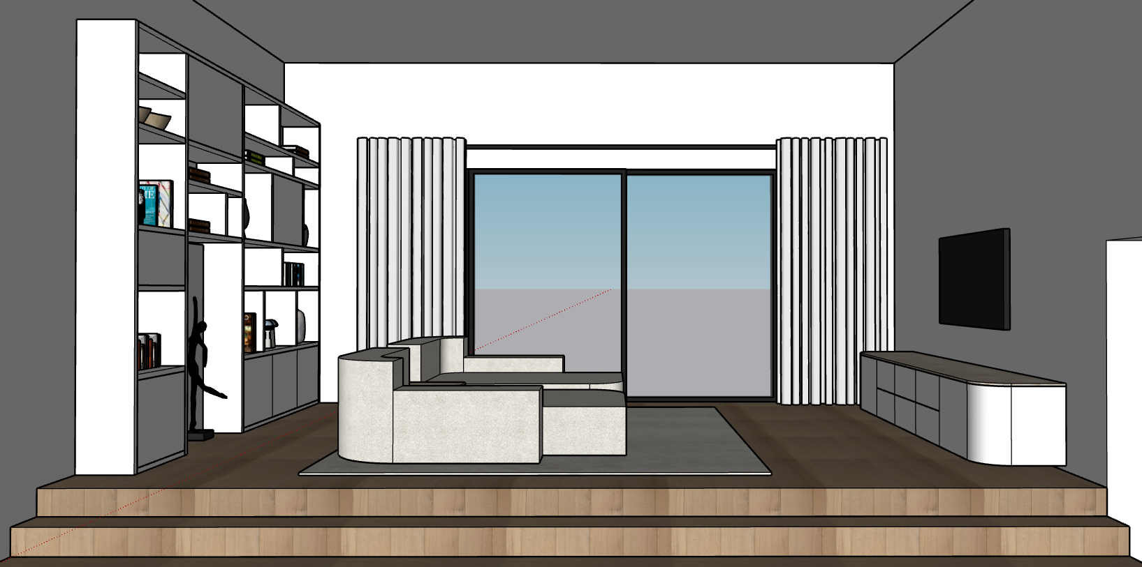 contemporary interior shot wall in warm white wood flooring side board in warm white with top in toblerone marble with tv on the wall the sofa in the center are in a light greenich fabric the library in warm white the rug is in light beige wool the view on a garden add a pippistrello on the right side of the sideboard architecture