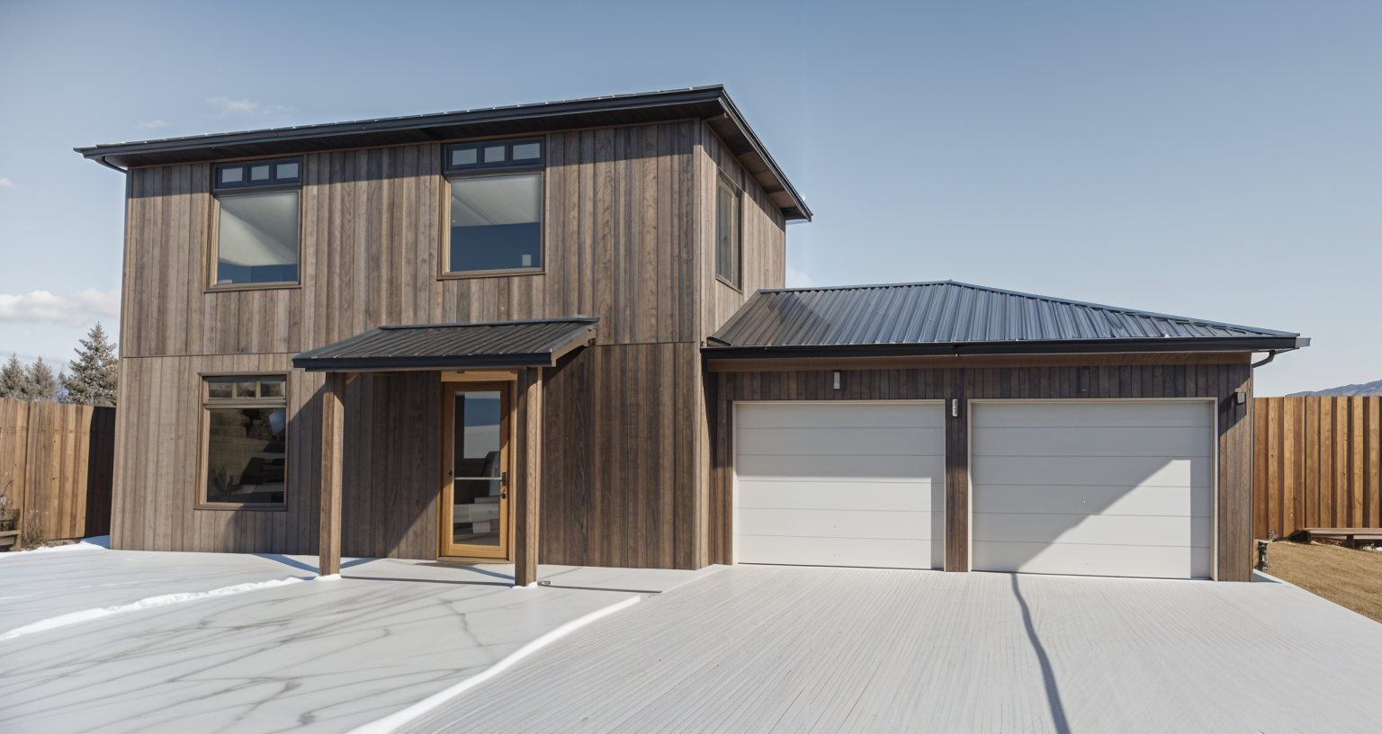 convert to a modern farmhouse style with black vertical board and batten walls and cedar wood window trims with california native landscape and trees in califonia sunny weather architecture
