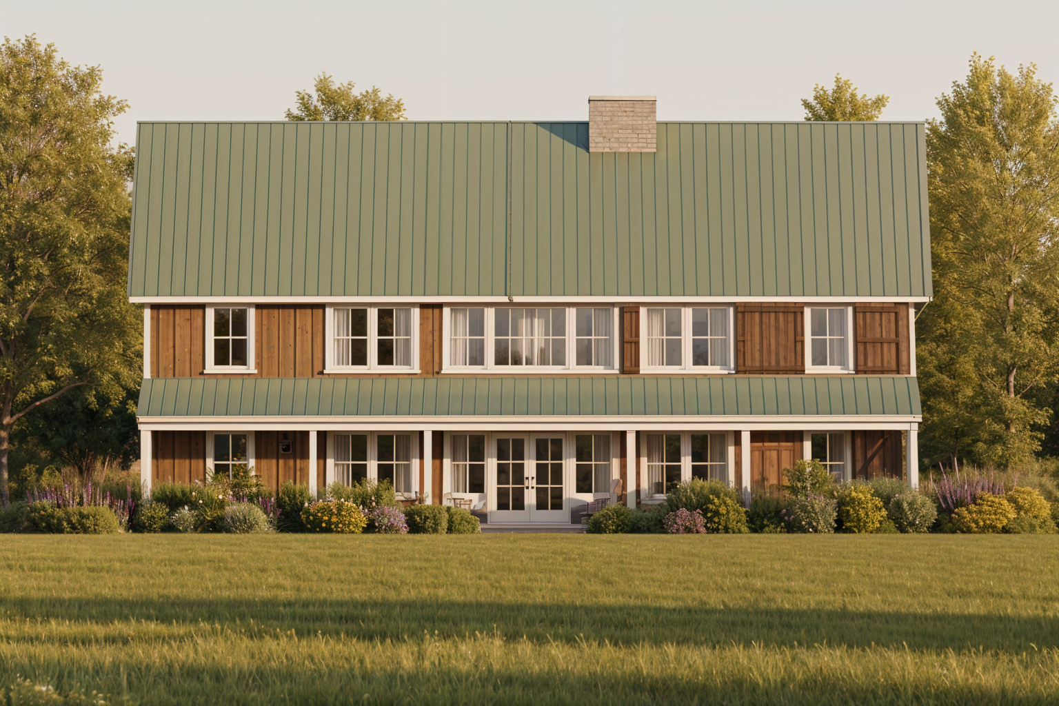 render a modern style metal cladded barndominium the vertical metal sided walls are painted in a flat brown no wood grain creating a welcoming ambiance the windows have white frames for a crisp contrast the metal roof and porch roof is a light green color adding a modern touch the chimney is crafted from rustic stone in shades of gray and brown adding texture the atmosphere is a open grass field bathed in the golden light of a late afternoon sun creating soft elongated shadows surround the house with landscaping containing bushes plants and flowers