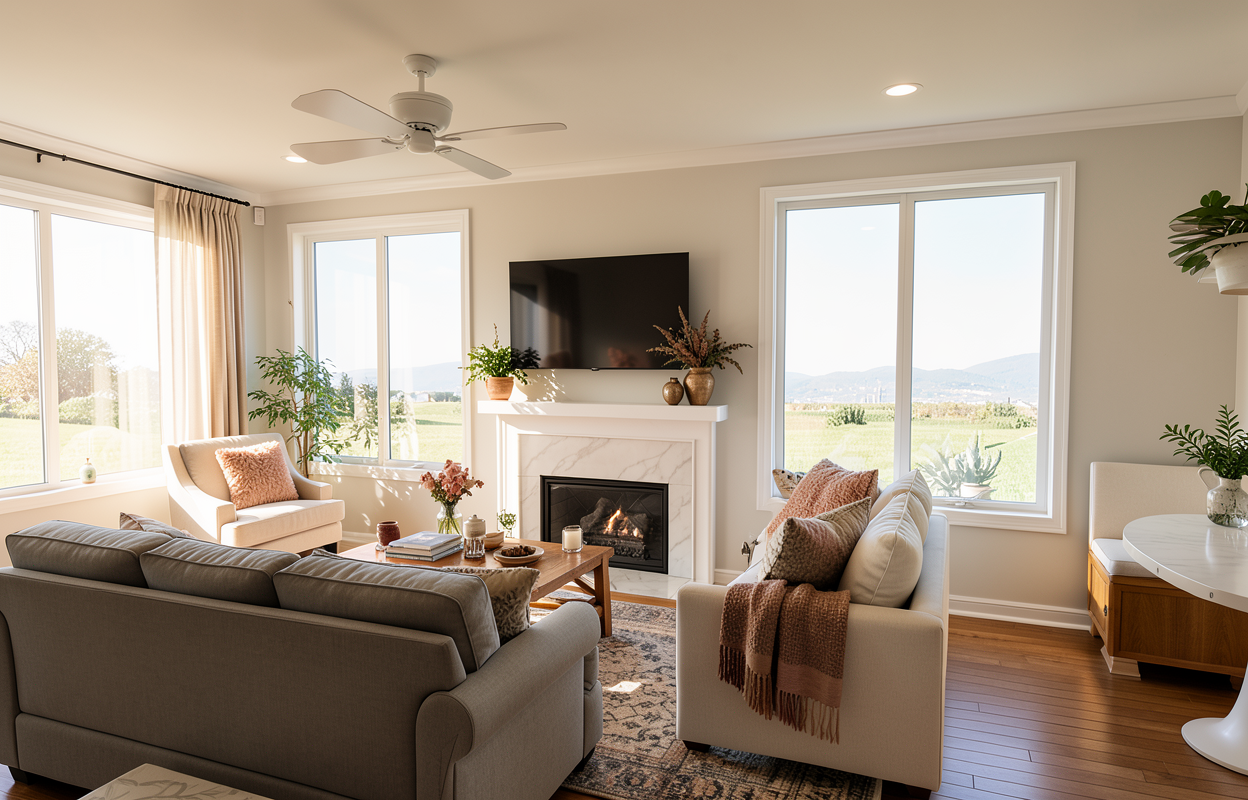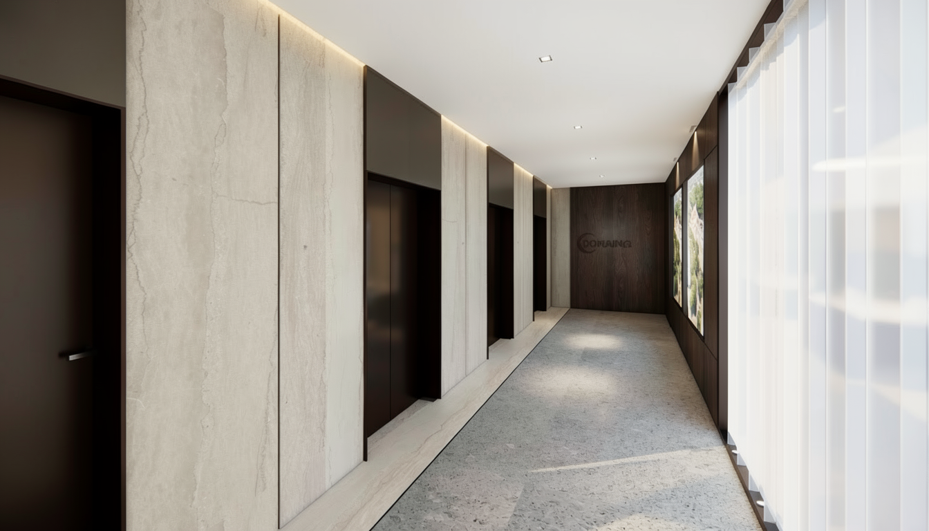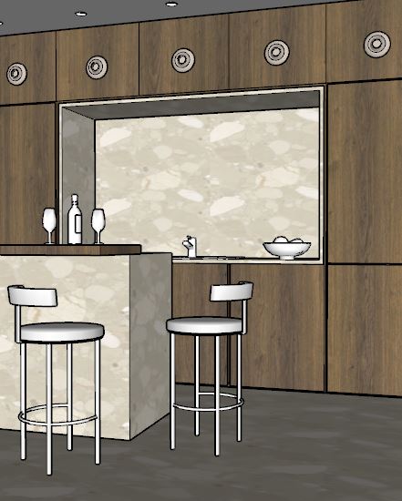 make this image hyper realistic preserving composition and design add a shelf at mid height in the kitchen niche made of the same walnut wood as the cabinets a warm linear led light should come from underneath the shelf soft and not too intense terrazzo floor must be porcelain tiles with large format pieces approx 120x120 cm joints should be minimal and barely visible rectified edges wood must be walnut matte finish natural texture no gloss stools with black metal structure and seats and backrests in deep bottle green velvet add a wine bottle and wine glasses filled sink in brushed gold finish lighting sunset natural light mixed with soft artificial light very poetic and editorial atmosphere air vents integrated in the upper cabinet area in brushed gold finish very high realism accurate materials subtle imperfections no plastic look