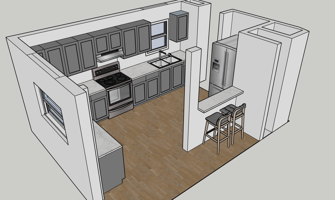 leave all materials and equipment the same make realistic remove shadows and make the window framses white make the wallss white take the woodgrain out of the cabinets