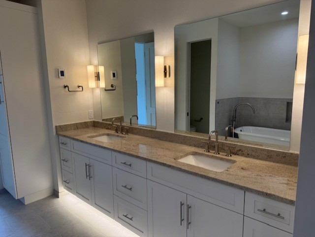 update this bathroom by swapping countertops with a natural white quartzite with some movement swapping out light fixtures but keep in same locations remove exisiting mirrors and replace with something more modern leave the remainder the same