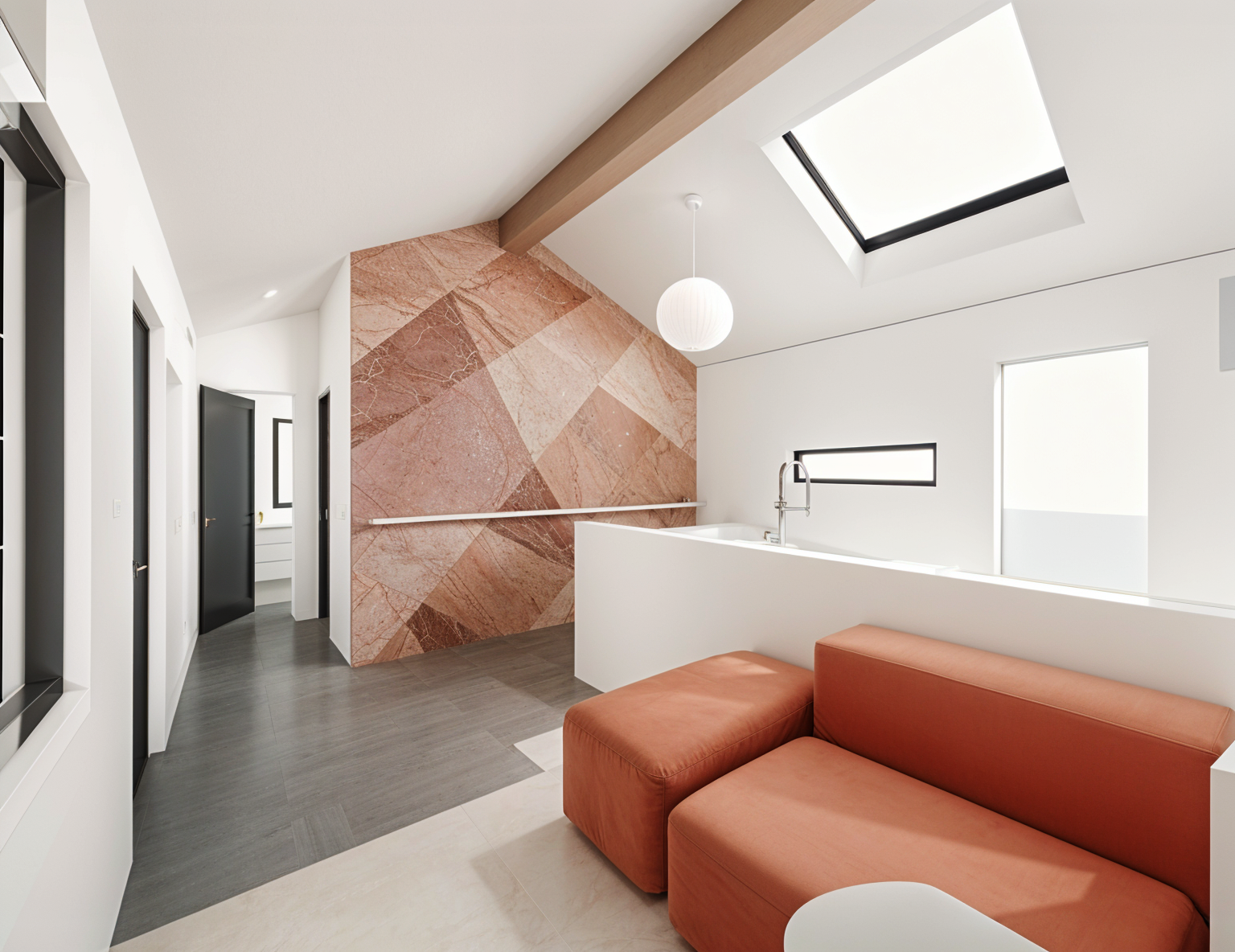 doors are olive concrete floors are industrial matte grey flooring under sofa is light douglas fir planks 12inches