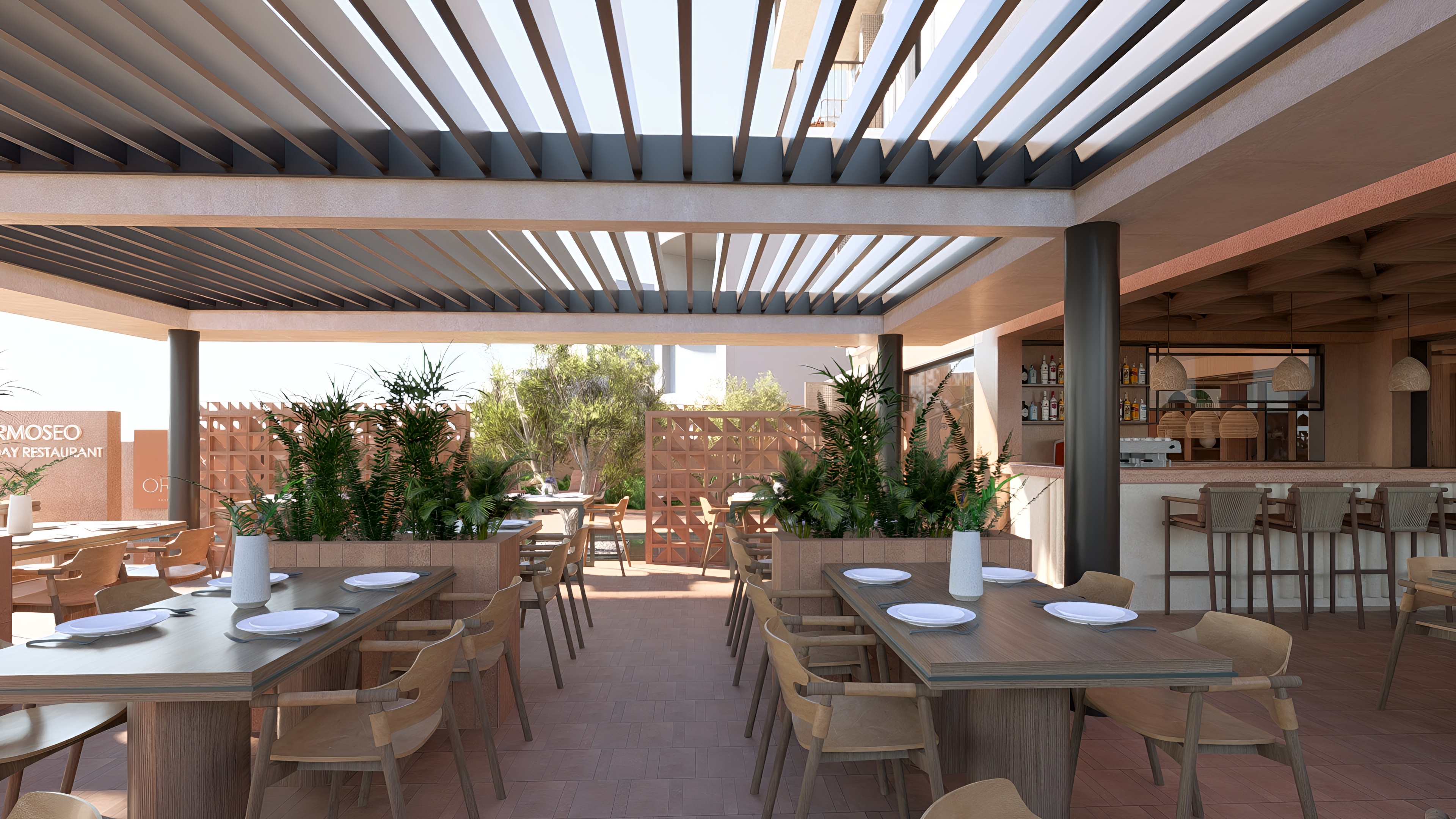 exterior restaurant area with terracotta flooring with a bar in the right corner