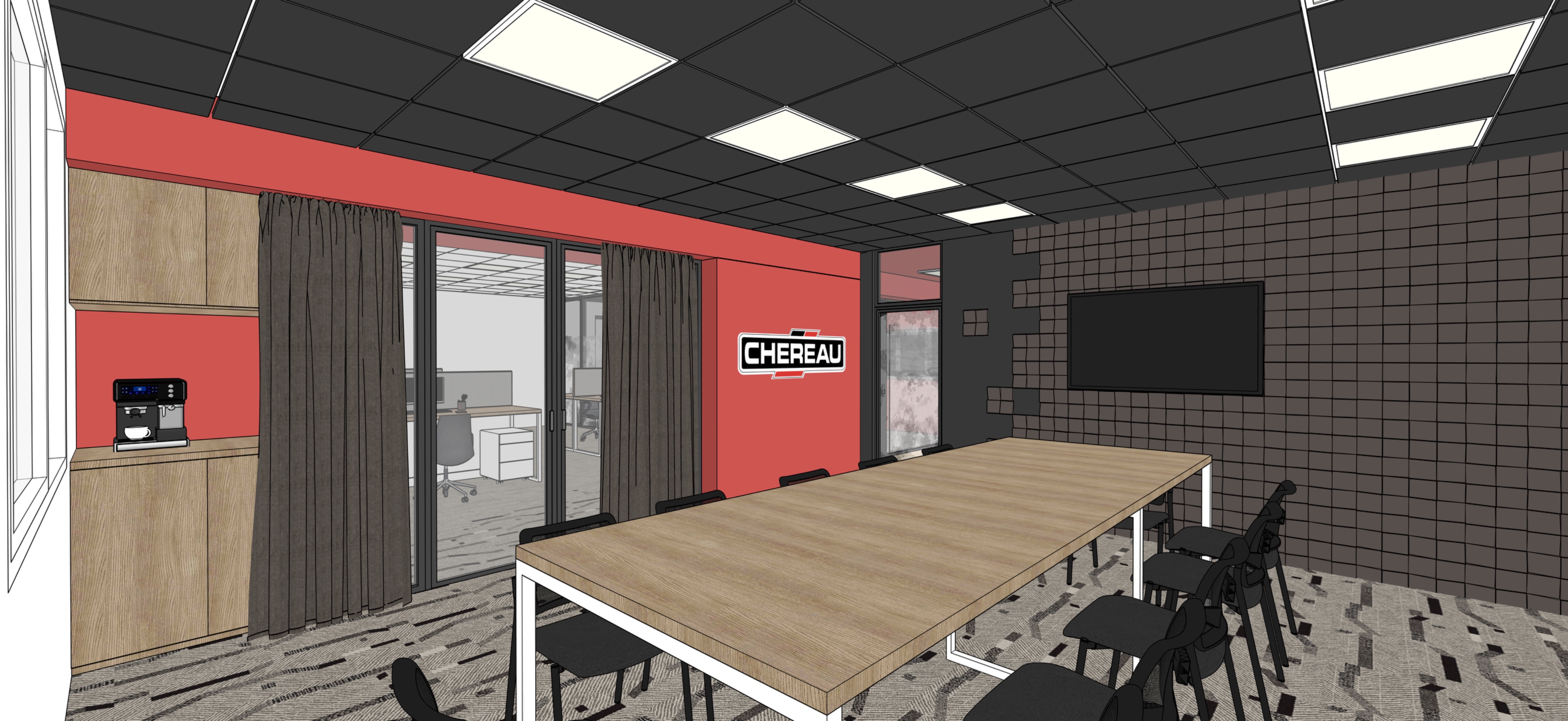la pi ce n a qu une seule fen tre sur la gauche c est la seule source de lumi re naturelle le reste des surfaces vitr e sont des cloisons modulaires vitr es donnant sur des pi ces aveugles