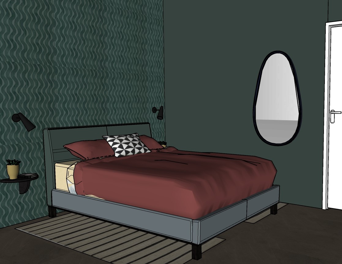 modern bedroom with a cozy and elegant atmosphere the walls are painted in deep forest green with a wavy texture add a sleek bed frame in muted teal complemented by a rich burgundy comforter place a geometric black and white pillow in the center the flooring is dark hardwood and a striped beige and grey area rug rests beneath the bed a round frameless mirror with a black outline hangs on the wall include minimalist black wall sconces and a small shelf with a potted plant in a matte mustard pot the door is a crisp white adding a clean contrast soft natural lighting creates a calm inviting space maintain the breakfast the props and the floors change the door to satine laquer color ral7021 and bring the real colour fo the rugs but make them more imperfect to look real