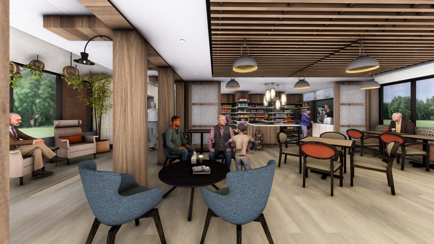 photorealistic image of senior living facility with cafe soft lighting and shadows