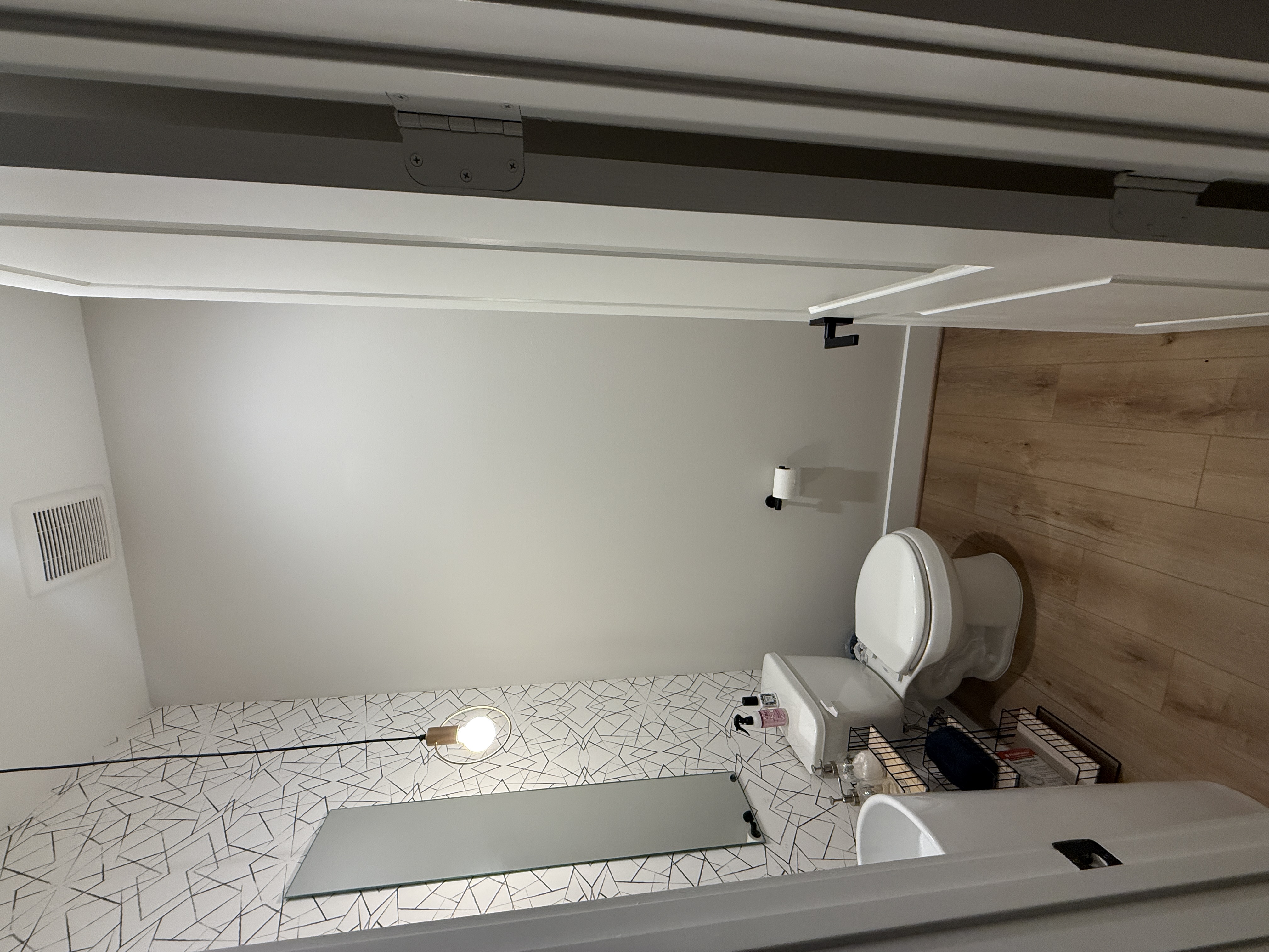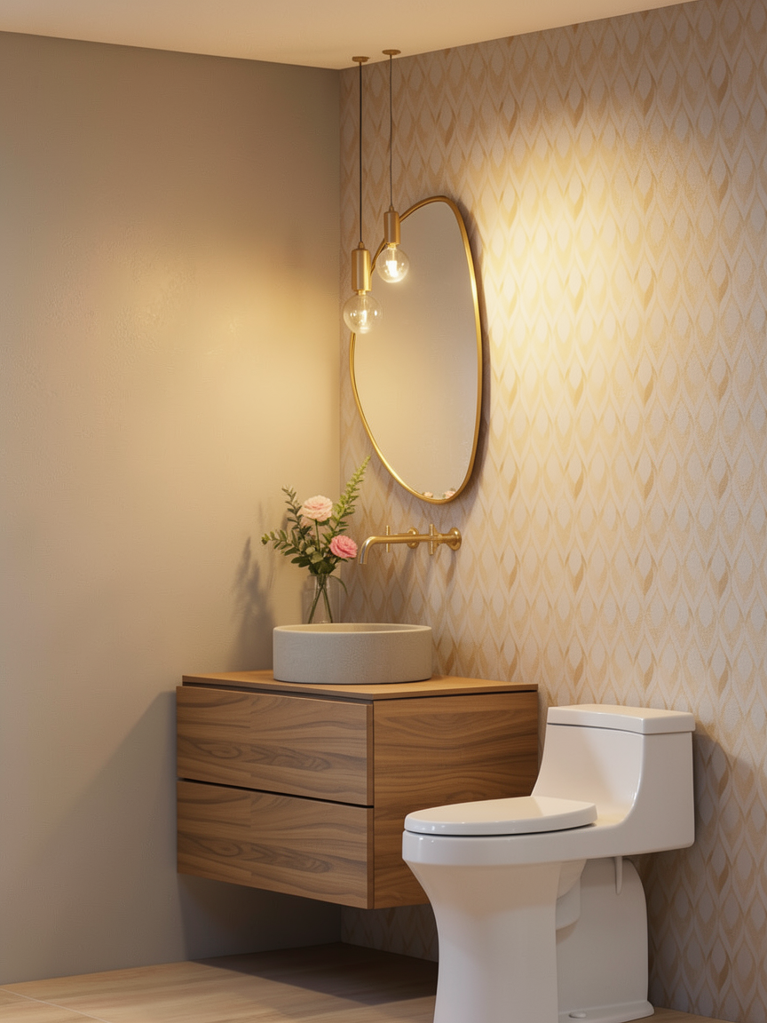 redo this bathroom to include deep plum color drenched walls and a modern chandelier light fixture