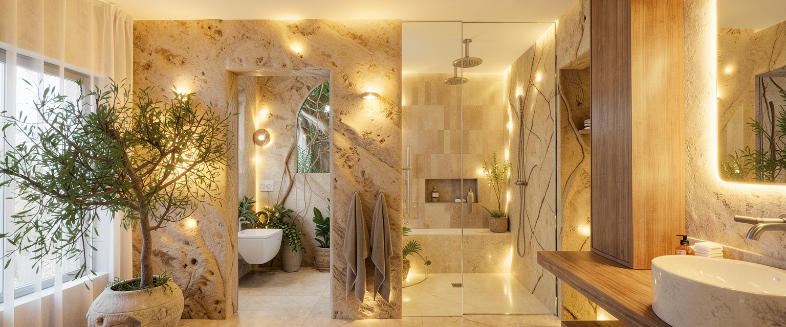 luminous bathroom organic plaster wall warm white stone floor tile in light beige terracotta wal tiles natural light and sink vessel in light beige concrete white oak cabinets