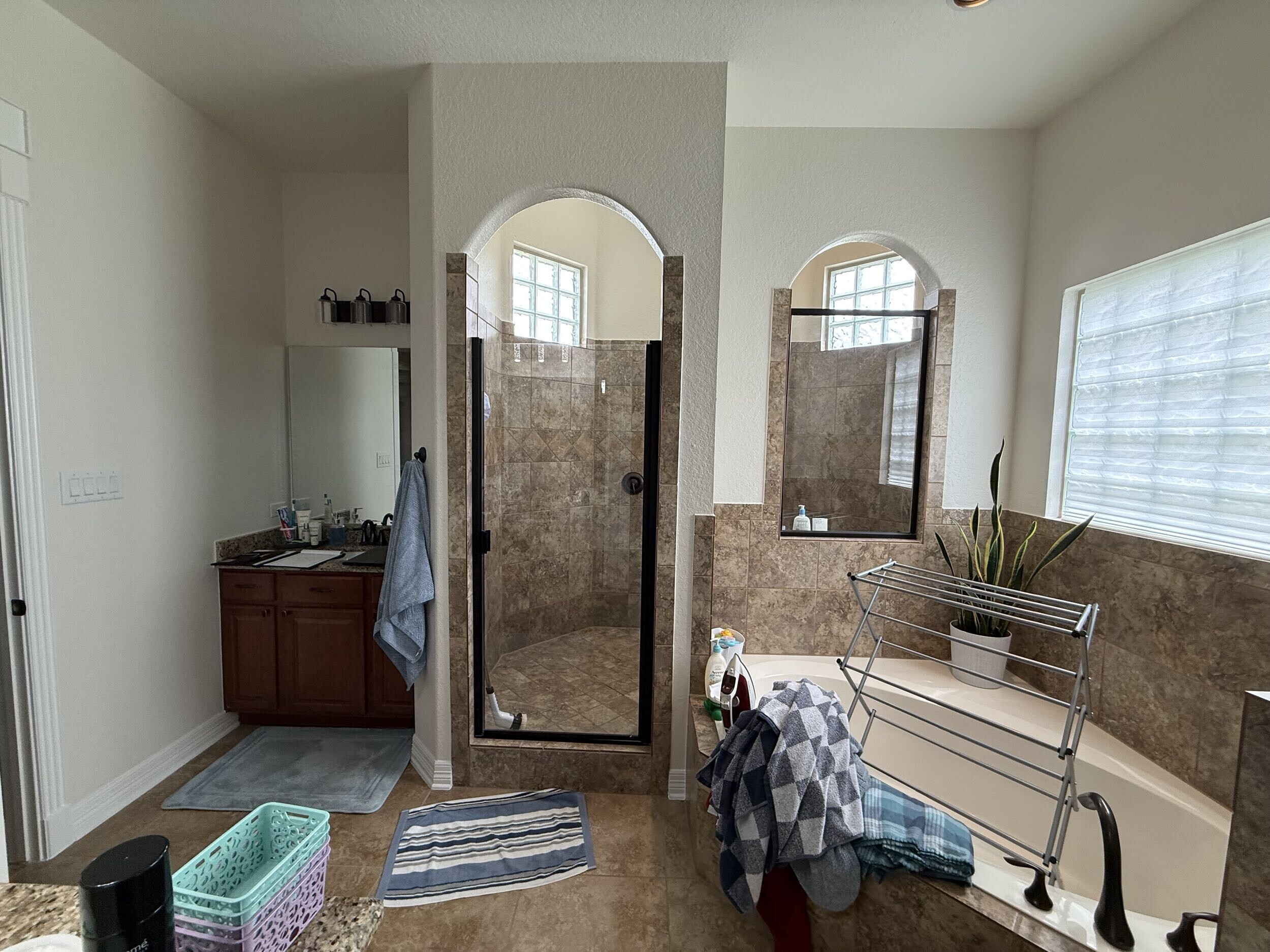 change shower walls into a pony wall with clear frameless glass on top remove the tub and put a sit down vanity beneath the window make the window smaller 4 wide x 1 tall and move it closer to the ceiling update the shower tile and floor tile to a marble look material make the cabinets a light stained color and add a light quartz countertop
