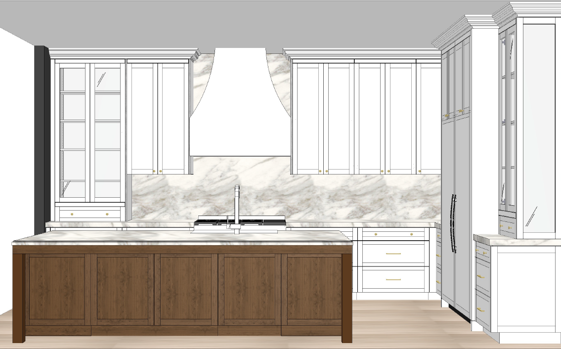 enhance rendering to be realistic add chandeliers above island change the island pedestals to be a real option add decorations add cremone bolts on the glass doors add 3 stools at back side of island