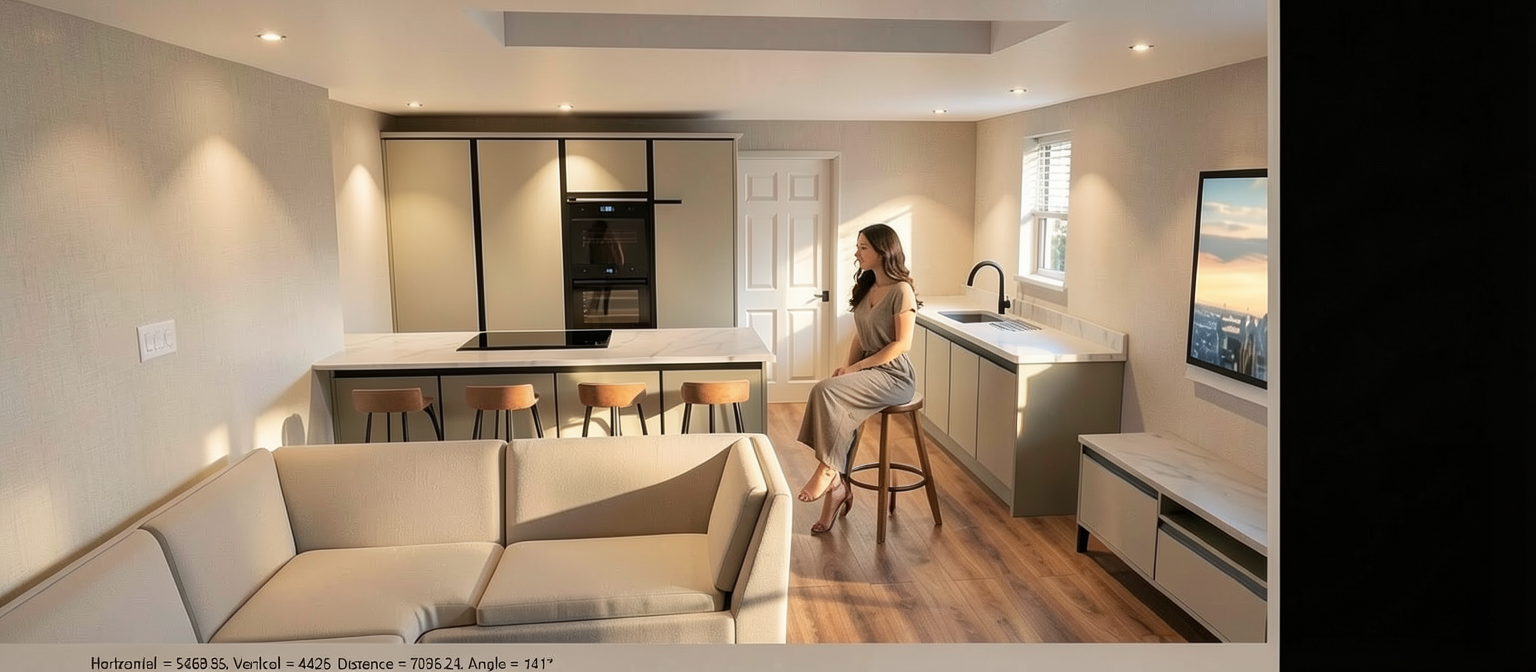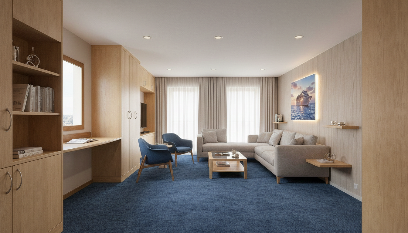 transform the provided theatre interior image into a high end photorealistic render with warm atmosphere soft glowing highlights and relaxed upscale coastal energy while keeping everything exactly the same same proportions same materials and same spatial configuration do not move or alter any objects geometry textures colors or furniture positions the chairs materials should read realistically the black wall is from acustic panels from reciclated materials carpet on the floor carpet on stairs wooden panels with carved lines a led light is hidden vertically in the slanted panels top strip made of thin wooden slats