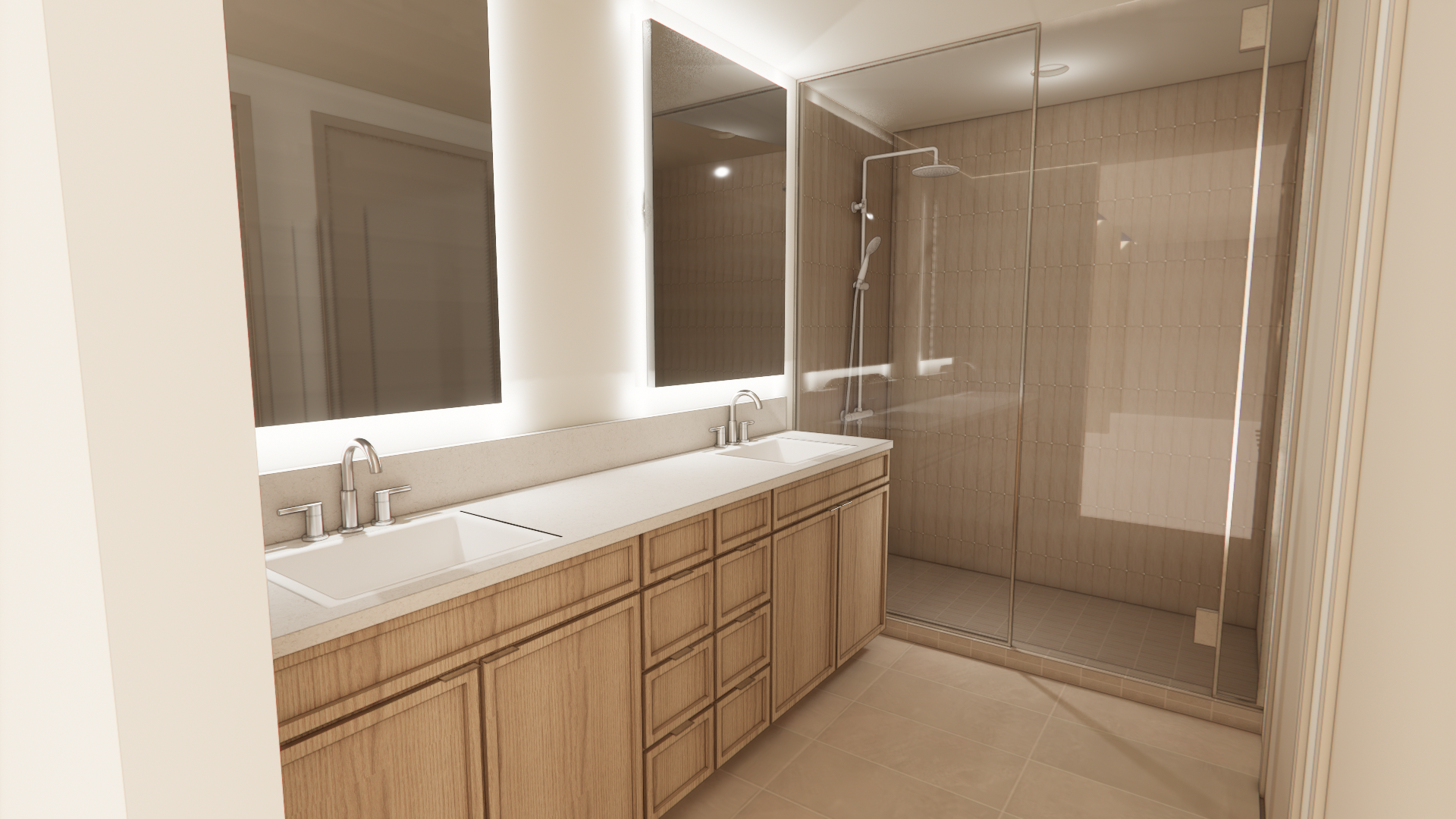 use the uploaded render as the exact base image maintain the original camera angle lens length perspective framing composition and spatial proportions exactly as shown do not alter architectural elements wall locations ceiling details millwork flooring layout window placement or built ins preserve all existing materials finishes textures paint colors tile stone wood tones and lighting design exactly as they appear maintain the same daylight direction shadow quality exposure and overall color temperature keep all furniture decor styling and layout exactly the same unless explicitly instructed otherwise do not reinterpret the design restyle the space modernize it or adjust proportions only modify the specific items that will be listed in the next prompt the goal is to enhance realism and material fidelity while preserving the original design intent 1 1 output should be ultra photorealistic with natural material depth accurate reflections realistic fabric texture subtle imperfections and true to life lighting eliminate hot light spot on shower wall
