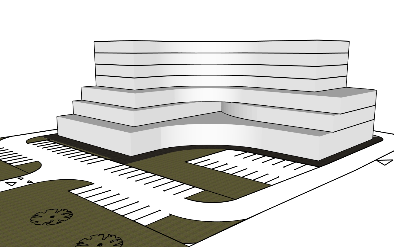 make a 3d exterior render of this building keep all lines and geometry unchanged and position the parking exactly as shown in the drawing the ground floor is a retail center the fa ade should emphasize vertical elements with evenly spaced partitions like a white concrete grid the roof of the ground floor should be a concrete terrace the first floor is office space with a fa ade combining glass and white concrete also with emphasized vertical elements the second floor is a hotel the fa ade should be predominantly glass and the roof of the first floor should be a green terrace floors 3 4 5 and 6 are residential the fa ade should be in harmony with the previously described materials and design the roof of the second floor should also be a green terrace make the render as realistic as possible all green areas on the site should be landscaped greenery all white areas on the ground should be asphalt the brown areas around the ground floor should be paving do not add any additional floors keep the existing number of levels and all shapes unchanged