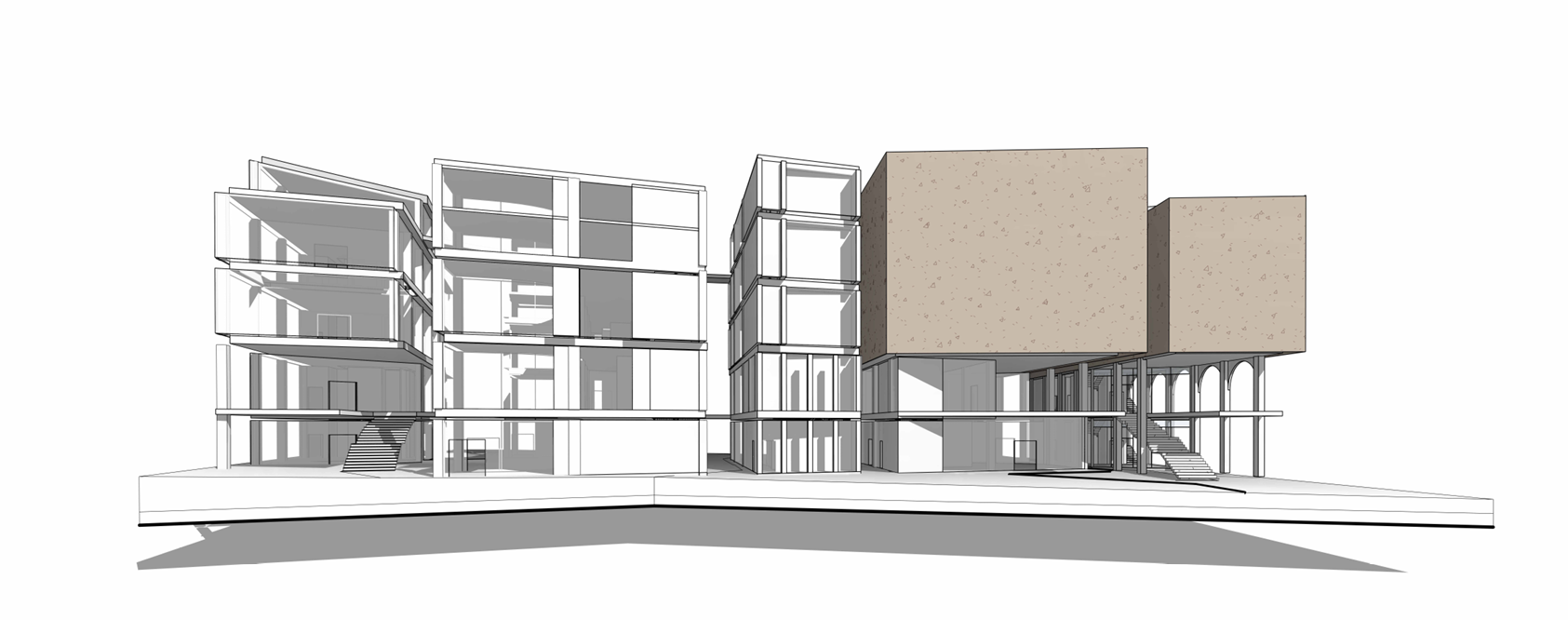the facade of the buidlings should be old clasical stone type for the bottom porcion and a grid of bricole plates for sunshading with diferent designs and holes on the top each has different color and texture and style in each of the 5 buildings should blend in a classical landscape of prague old town the building is a museum of decorative arts do a clasical look with modern look on the top part architecture