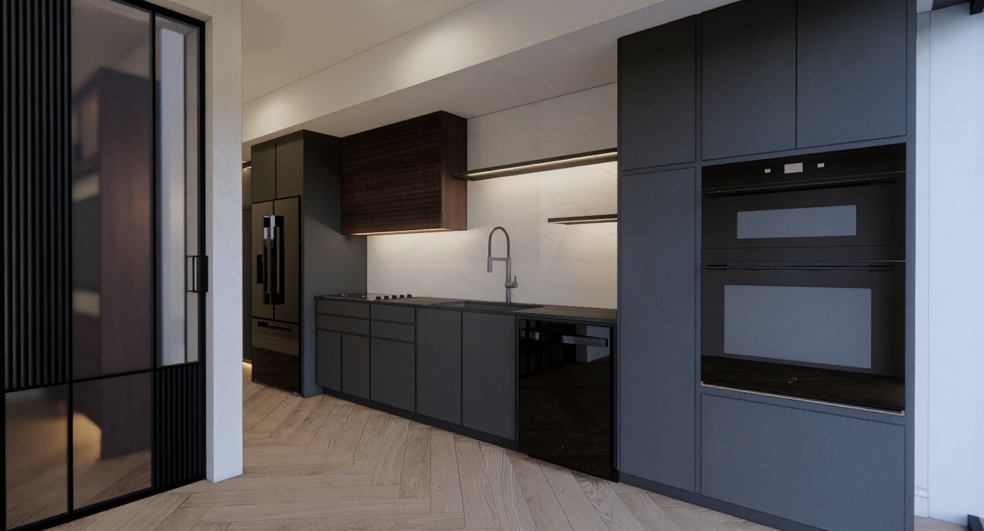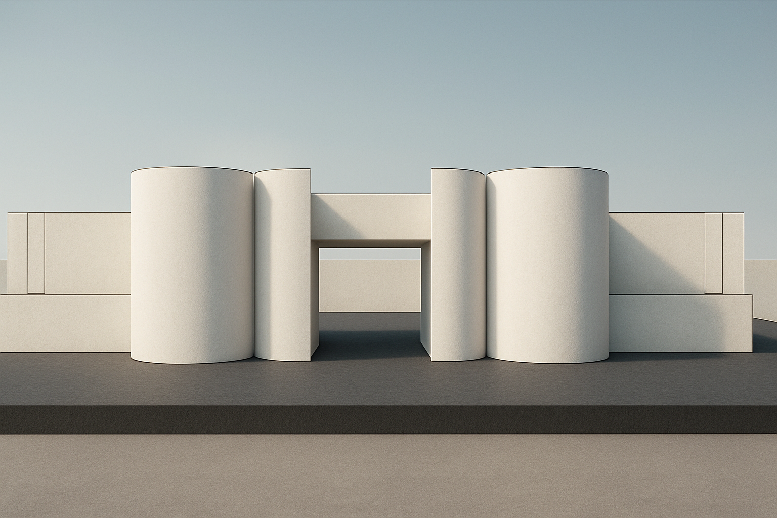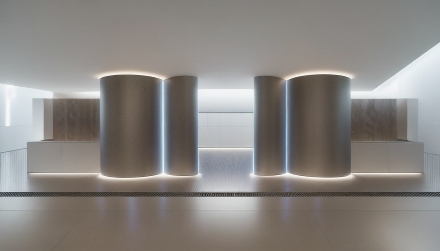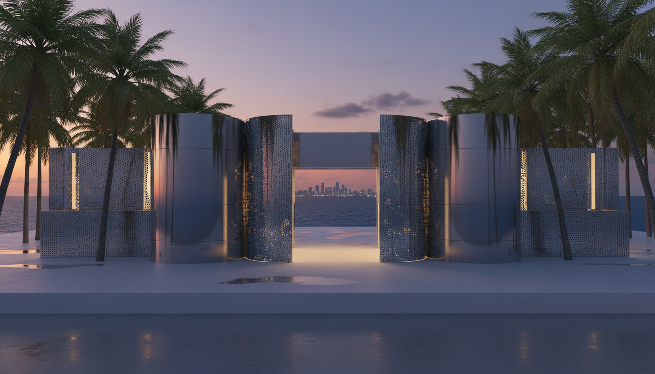 a futuristic f1 art gallery located on dodge island miami surrounded by large palm trees shimmering waters and sleek reflective surfaces architecture blends perforated metal facades shiny steel panels and soft ambient lighting the building evokes speed luxury and innovation inspired by formula 1 aesthetics and tropical modernism