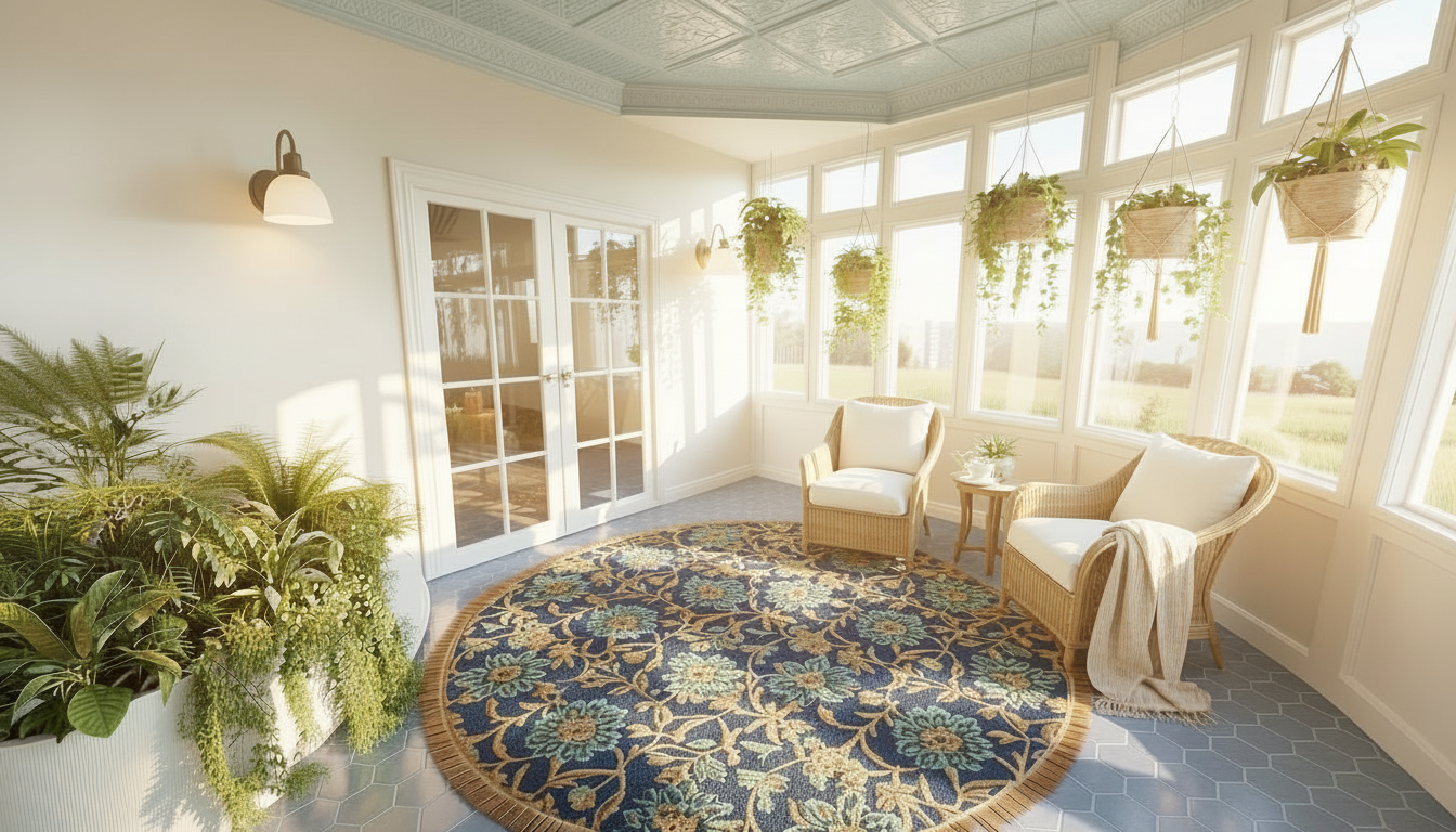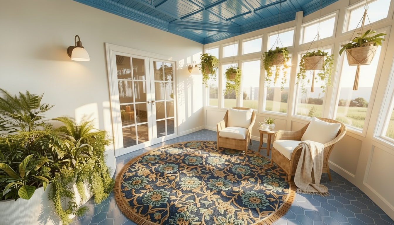 keep everything about this image the same except make the color of the tin ceiling and tile floor a baby blue