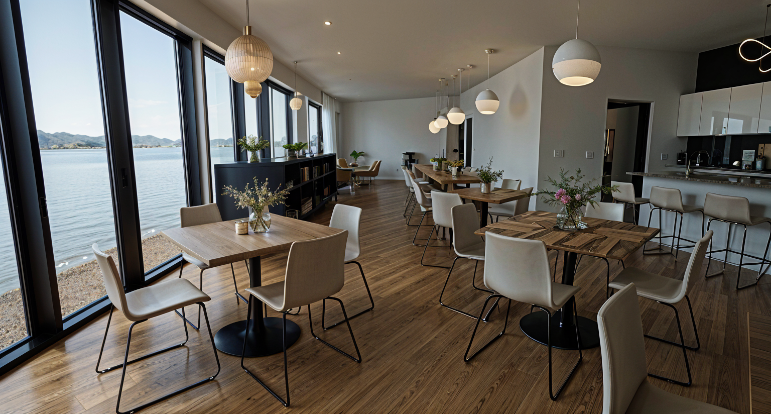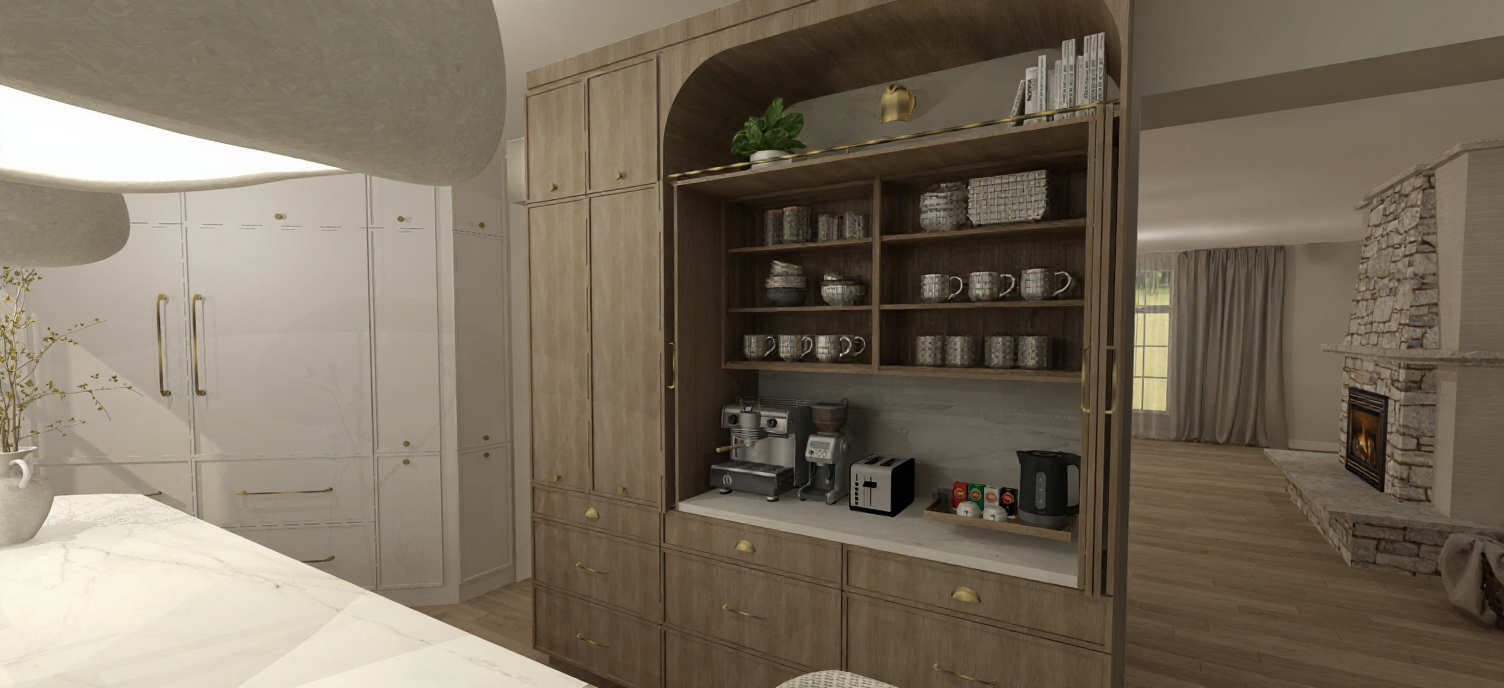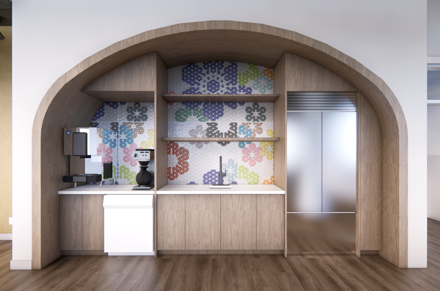 render a modern kitchen alcove with a smooth wooden arch use natural oak wood tones for the cabinetry and create a vibrant floral tile backsplash with colors like hoshi mosaic white and clay the countertops should be crisp white include sleek stainless steel appliances the atmosphere is cozy and warm with gentle diffused natural light enhancing the overall harmony and elegance of the space
