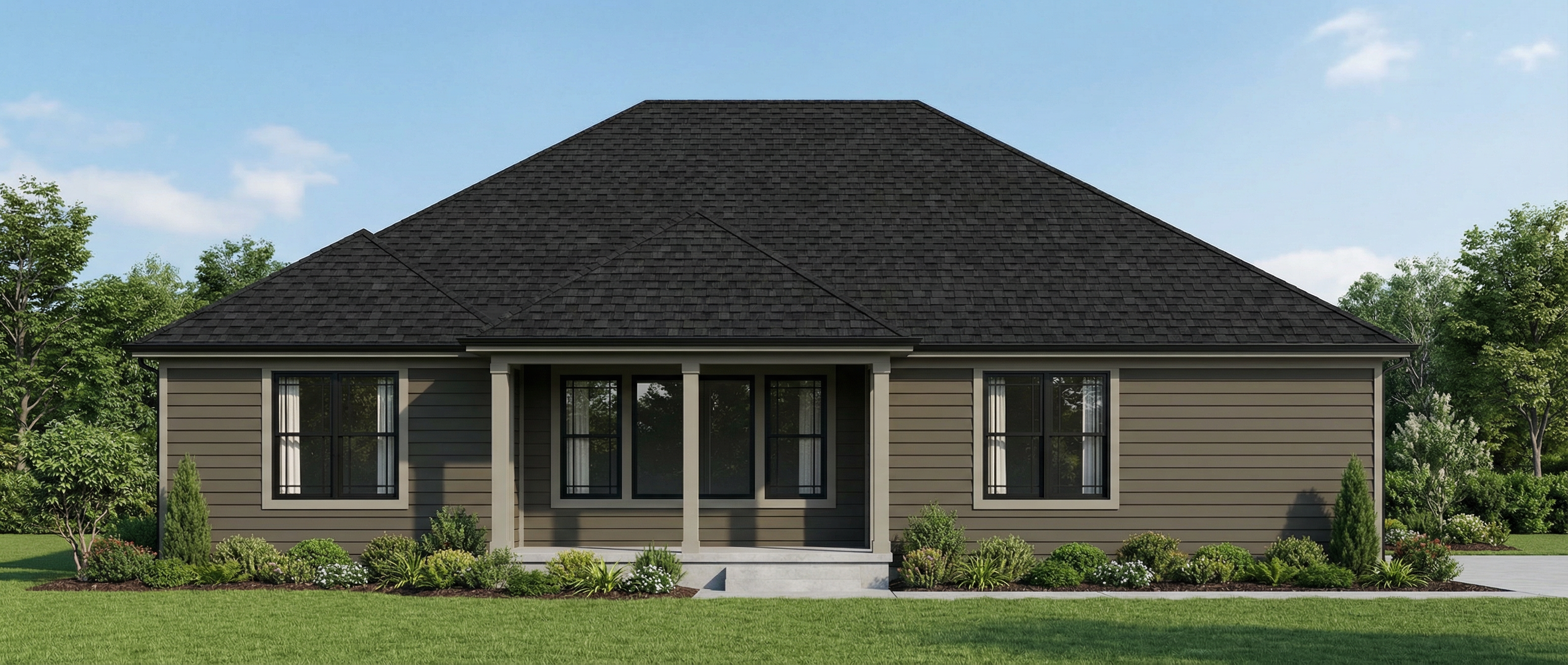 make the shingles windows and gutters black soffit colored felted wool make siding urbane bronze keep hip roofline remove corbels make posts felted wool color remove brick from wainscott but not the side