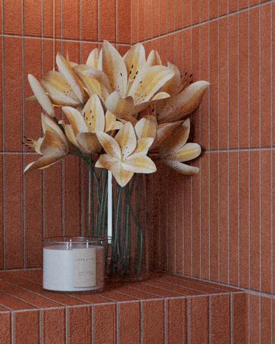 type of image editorial close up architectural photography hyperrealistic material refinement scene framing close up shot of a glass vase with flowers and a candle placed on a terracotta tiled surface in a corner keep the exact framing angle crop and composition unchanged instructions priority strictly preserve all elements exactly as they are no reinterpretation no redesign no additions elements strict preservation flowers critical preserve the exact flowers species colors petal shapes imperfections and density do not replace restyle or enhance do not modify color or volume glass vase keep exact shape and proportions enhance realism subtle refraction slight distortion through glass visible water line natural stem distortion inside candle zara home the candle is a zara home product minimal elegant design with neutral tones and subtle label preserve exact shape size wax level and label placement enhance realism of matte glass container soft wax texture subtle printed label detail do not redesign or stylize materials refinement only terracotta tiles matte ceramic finish with fine grain texture reduce digital noise replace with controlled natural texture subtle tonal variation between tiles off white recessed grout lines clearly defined but soft increase depth through micro shadowing in joints lighting clean but real preserve original lighting direction and mood refine only reduce heavy noise grain improve clarity of light on surfaces maintain warm ambient tone soft shadow definition in the corner no new light sources no change in lighting direction color maintain original terracotta palette slightly deepen tone for richness not saturation boost avoid washed out or overly clean look style high end editorial photography tactile realism clean but not sterile subtle cinematic presence quality ultra detailed physically based rendering sharp material definition no digital noise controlled fine grain only restrictions critical do not change flowers in any way do not redesign the candle must remain zara home style as is do not alter composition or crop do not add or remove objects do not smooth textures excessively do not introduce new colors do not reinterpret the scene