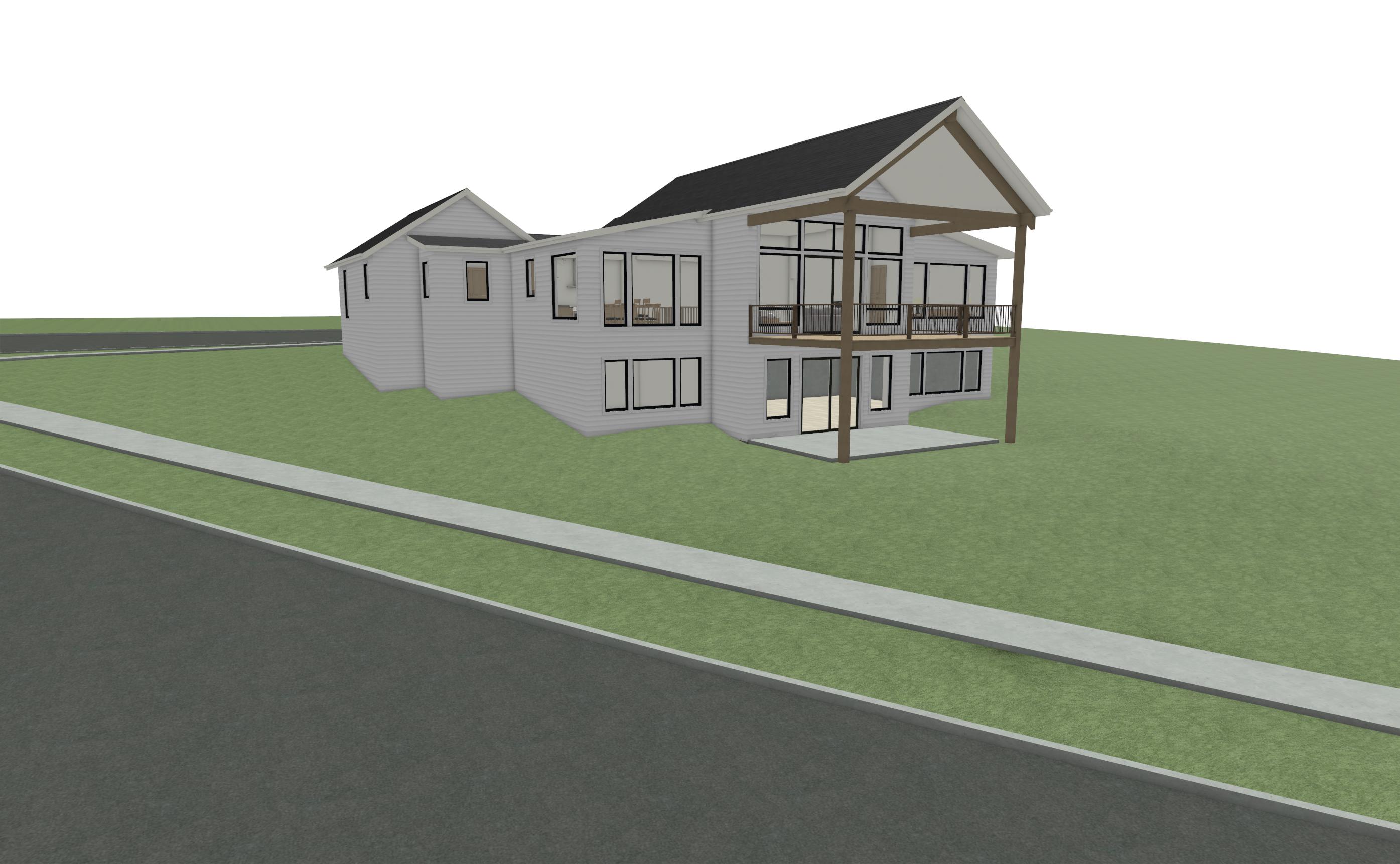 wood siding main siding is charchoal black and as an accent natural weathered wood with visible grain variation subtle color shifts slight roughness and realistic aging high end mountain modern jackson hole style stone veneer sharp high detail stone texture with depth shadow between joints natural color variation cool grays tans realistic mortar definitionmetal roof trim matte dark asphalt shingle and dark fasciawindows doors keep exact mullions and layout enhance glass realism with slight reflectivity and interior glow this is in the montana with views of the bitteroot no trees close by the hill slopes down in the back this is in a suburb so add houses around it there is no house directly behind the deck do not switch up the gable material from whats below so if black siding on wall make black in gable if would on main then would in gable there are houses directly behind and to the right of this view the slope of this green grass is acurate dont change it