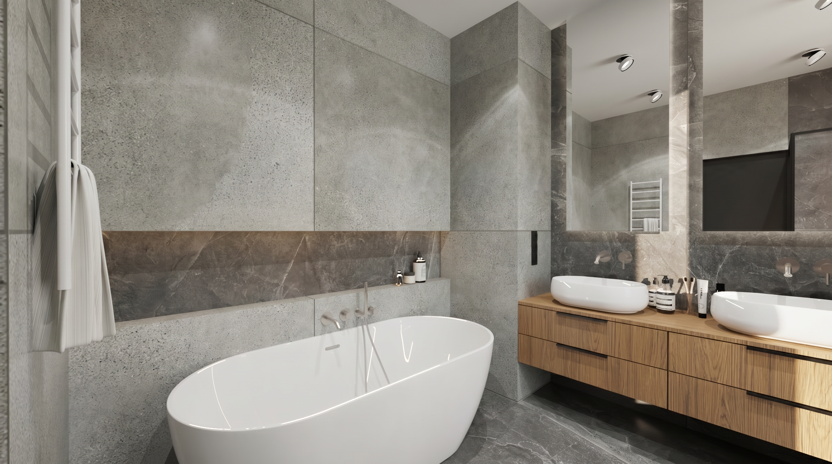a calm elegant contemporary outdoor courtyard with a minimalist architectural language the scene features a tall central decorative screen made of vertical beige slats creating a refined semi transparent partition and adding rhythm depth and visual lightness to the composition the surrounding walls are smooth warm white plaster keeping the palette soft and understated lighting should be soft and natural like late afternoon daylight with gentle shadows and a calm luxurious mood the final render should look refined realistic and architectural with strong material clarity and a high end design feel