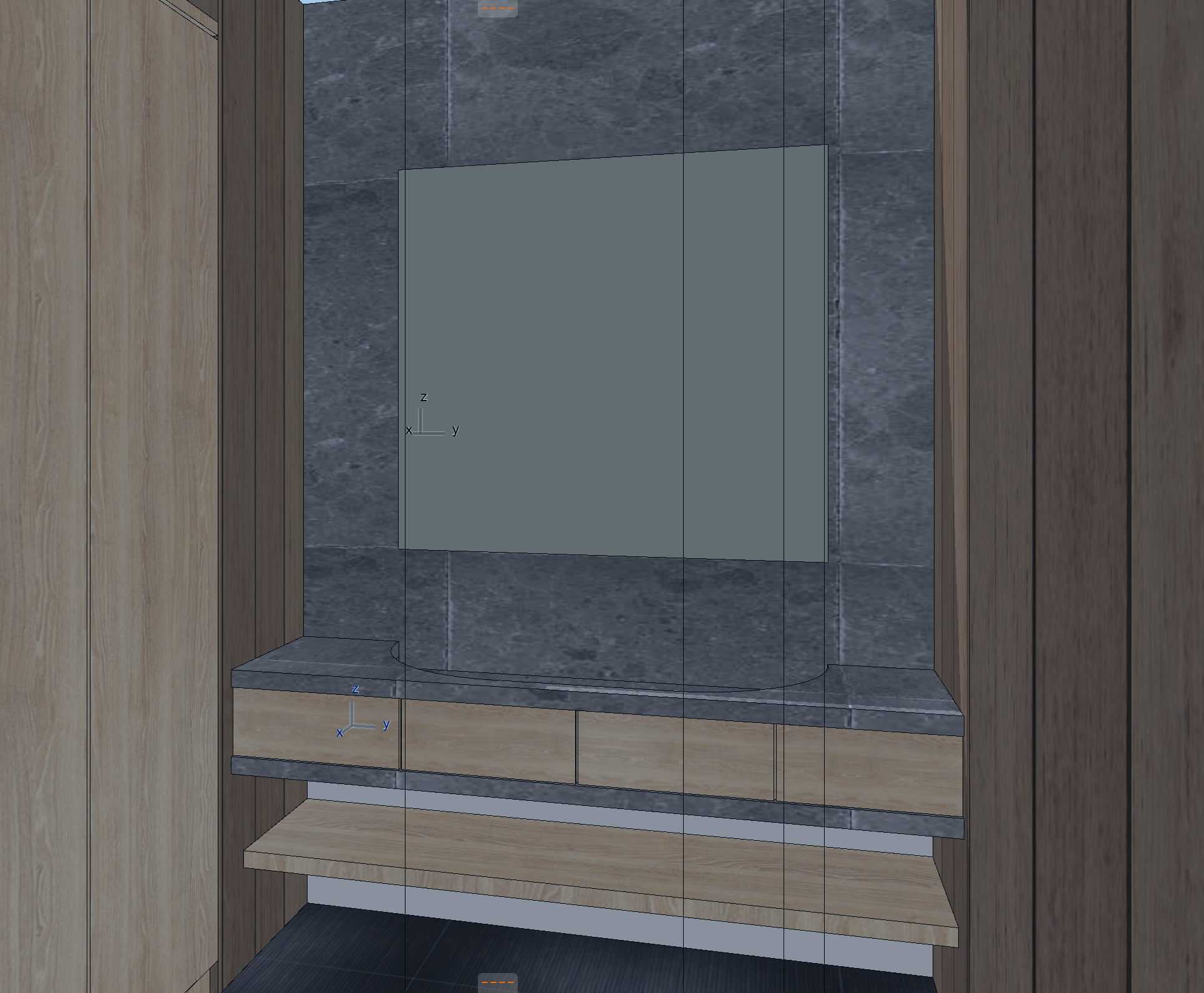 medium black stone countertop with medium veiling white oak cabinets and drawers black ribbon floor tile white sheep skin rug on floor wall material to be white oak vertical boards