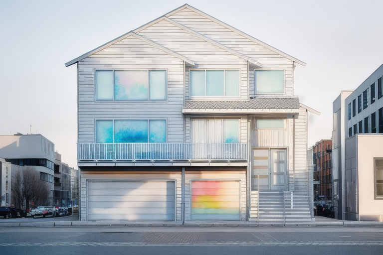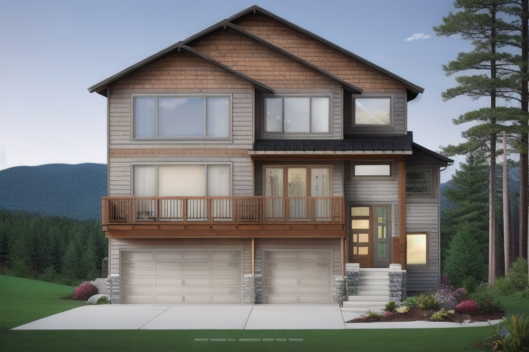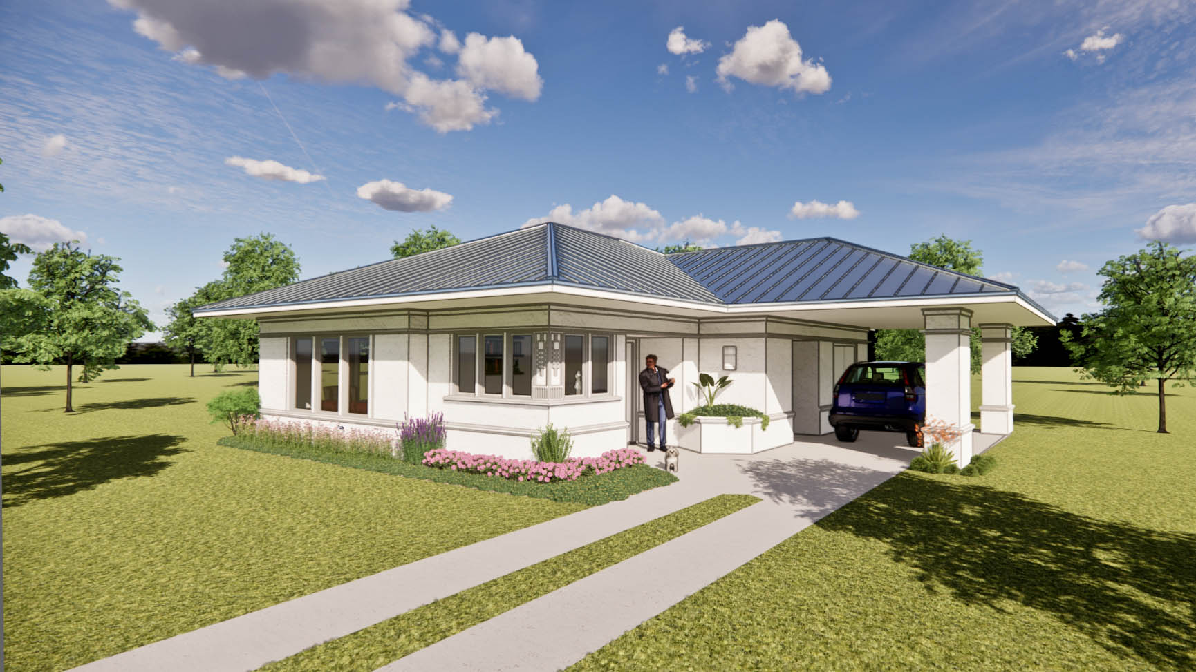 render a modern house with a sleek minimalist design set on a sunny day the house has a natural shake shingle roof and white walls with subtle earthtone accents surround the house with lush green grass and vibrant flowerbeds featuring pink and purple blossoms place several large texas oak trees with full foliage around the house casting gentle shadows the driveway is light gray leading to an open carport with a blue car include a clear blue sky dotted with fluffy white clouds the atmosphere should feel serene and inviting emphasizing natural beauty and modern architecture